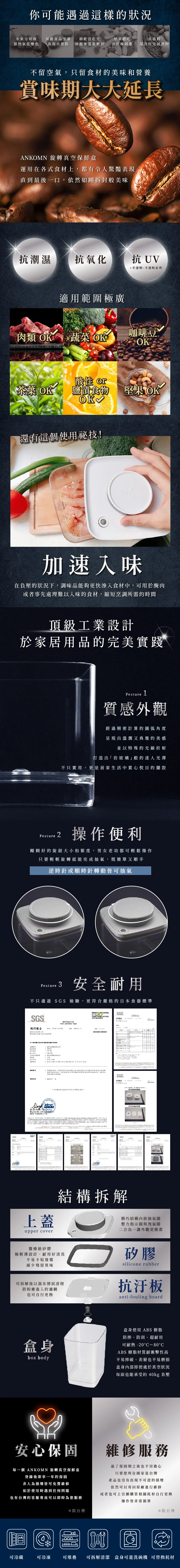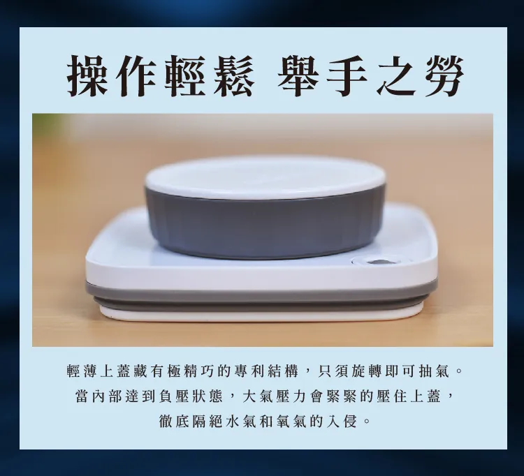 轉動瓶蓋上的旋鈕即能抽真空,適合冰箱收納鮮食蔬菜、寵物各類零食、乾香料收納、咖啡豆茶葉收納,保存風味更持久