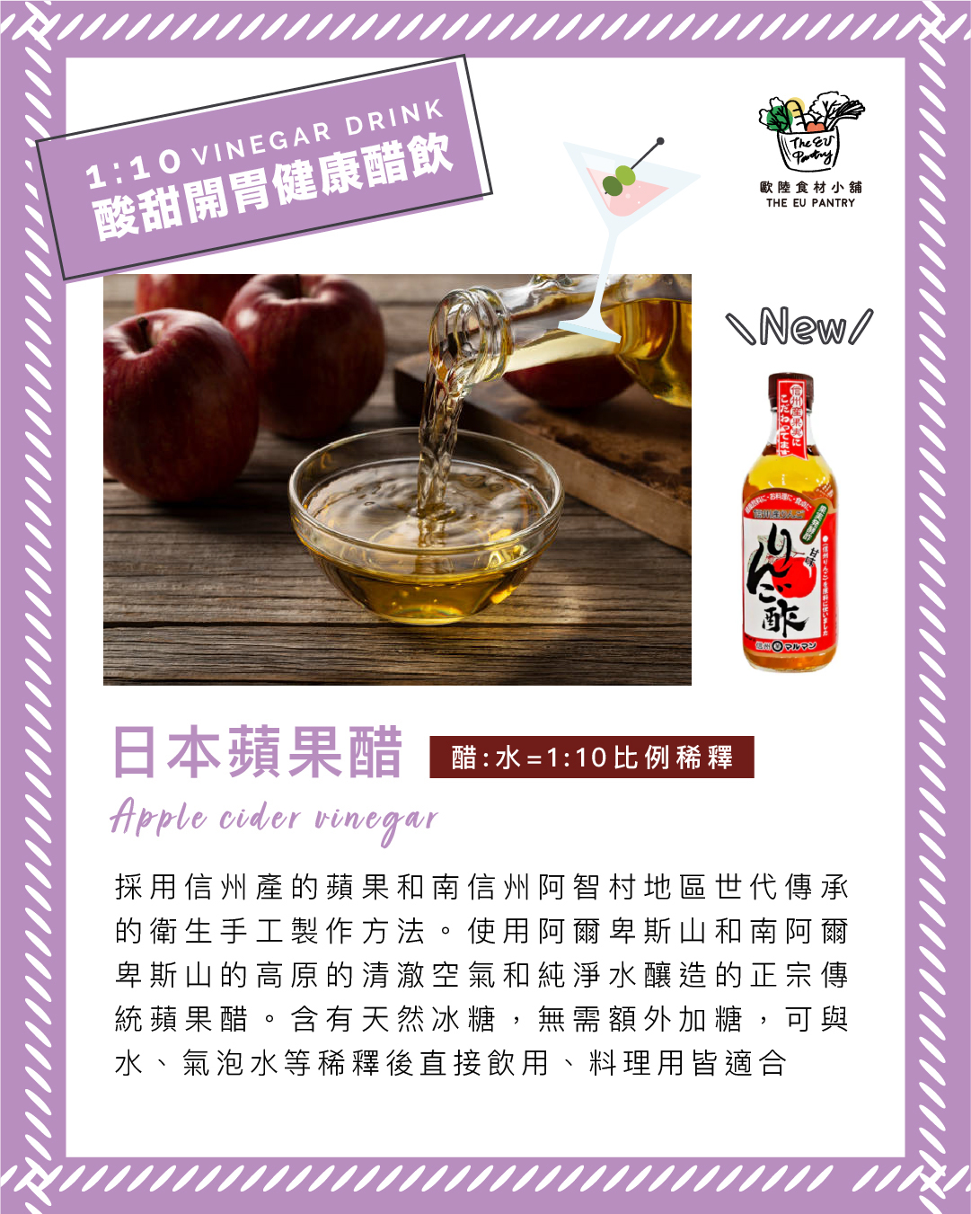 日本信州產的蘋果製成,營養和健康的飲品,含有天然冰糖,無需額外加糖,可與水、氣泡水等稀釋後直接飲用、料理用皆適合