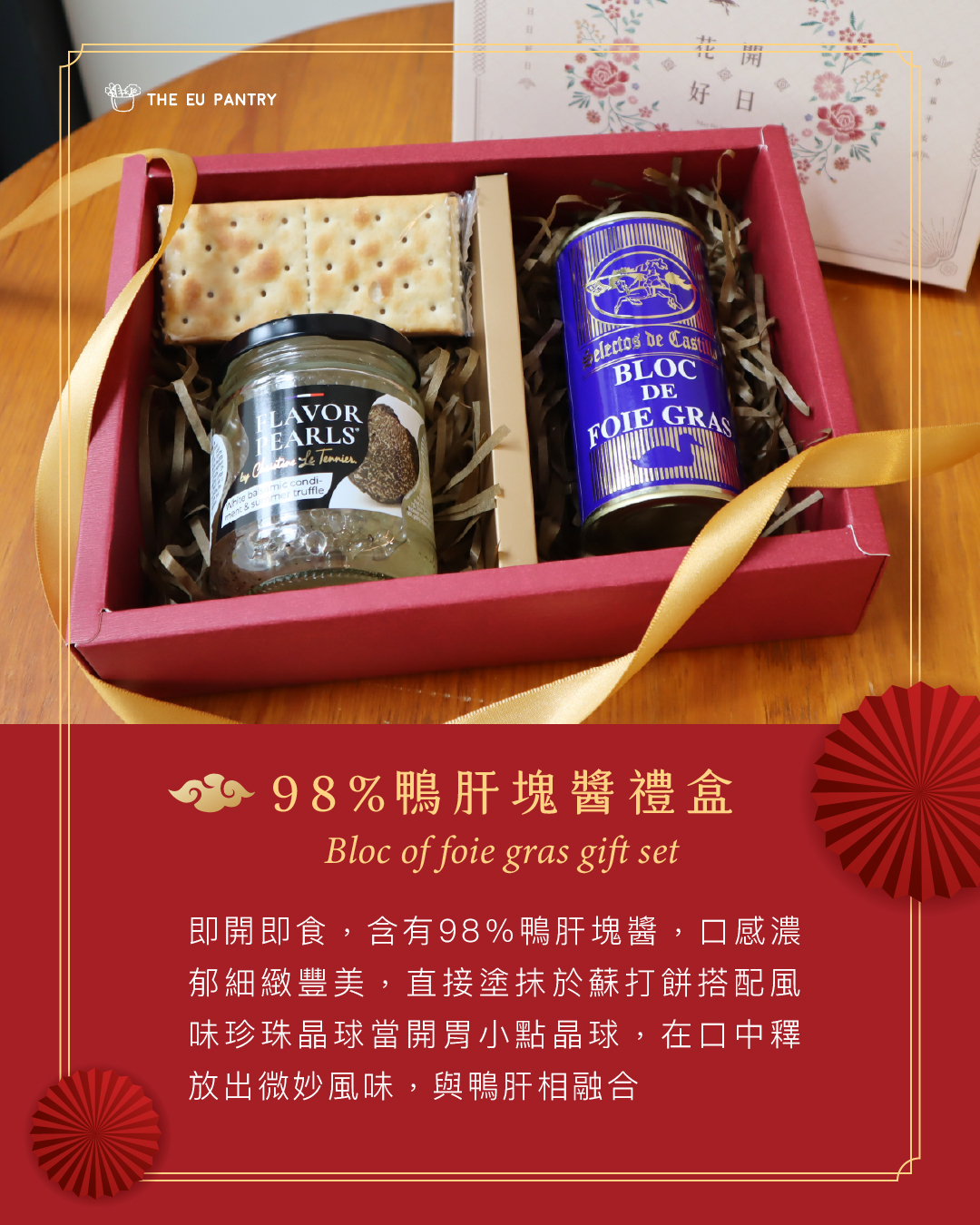 禮盒內含:西班牙鴨肝醬塊、法國松露風味晶球、義大利蘇打餅