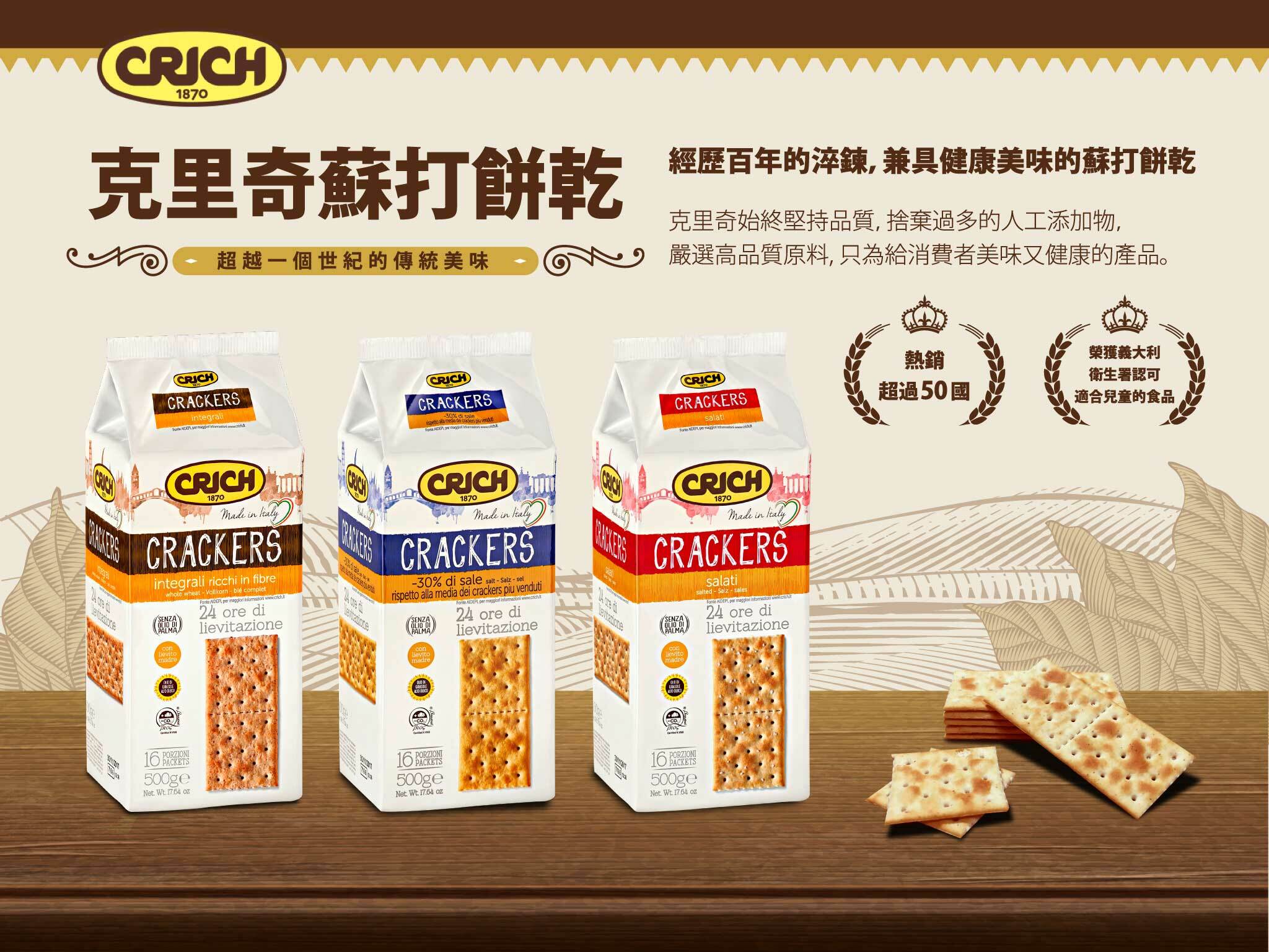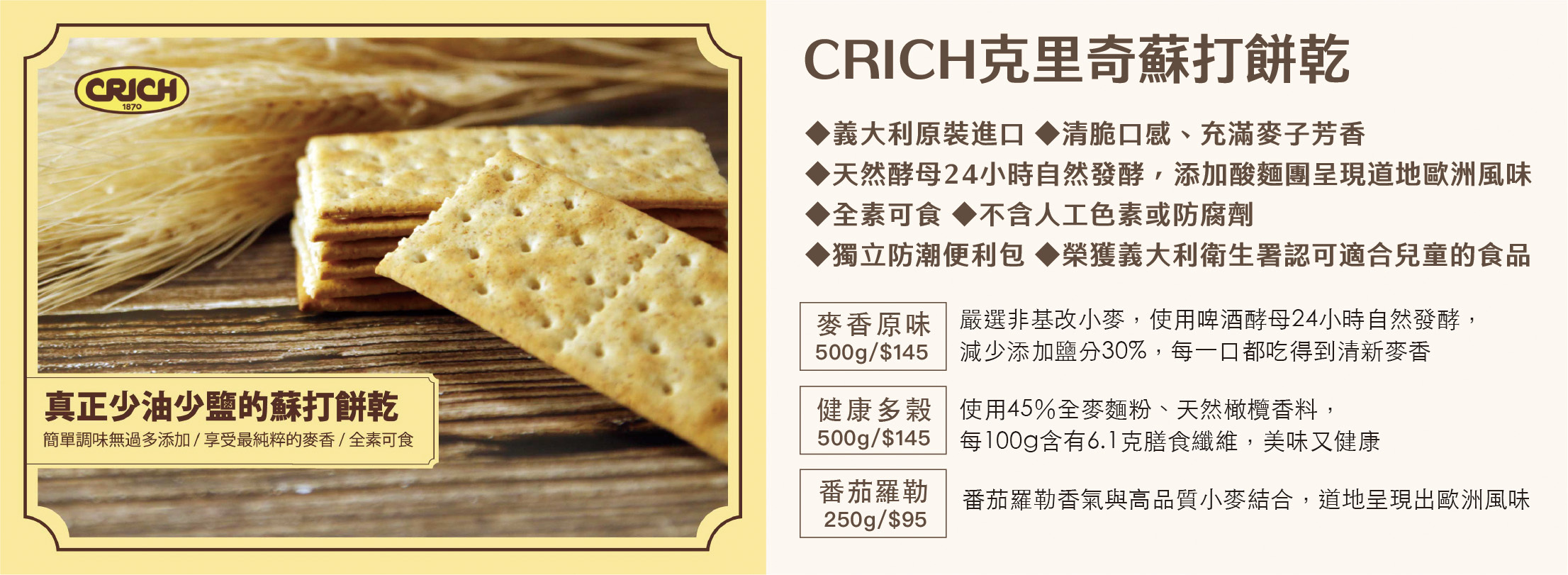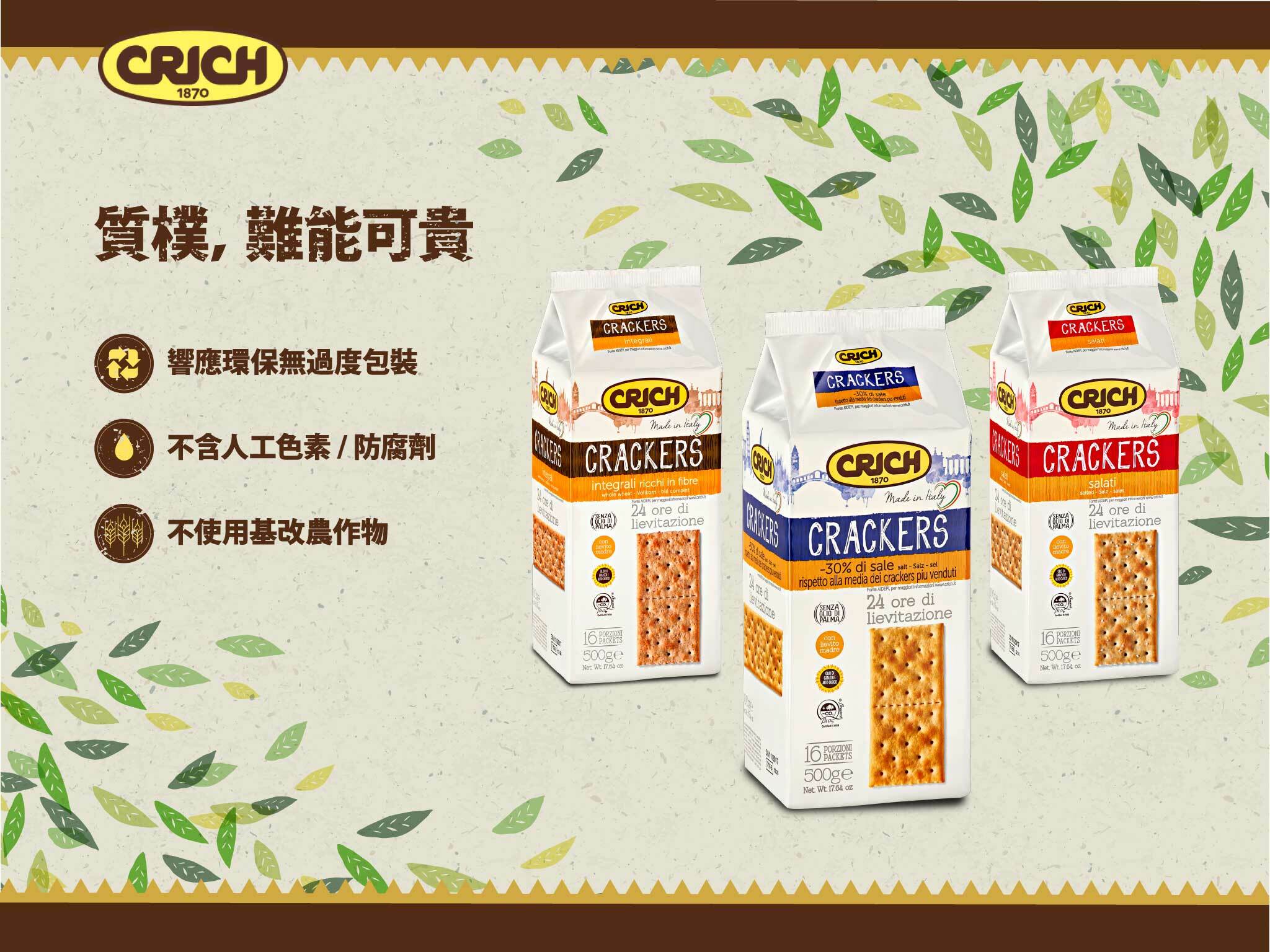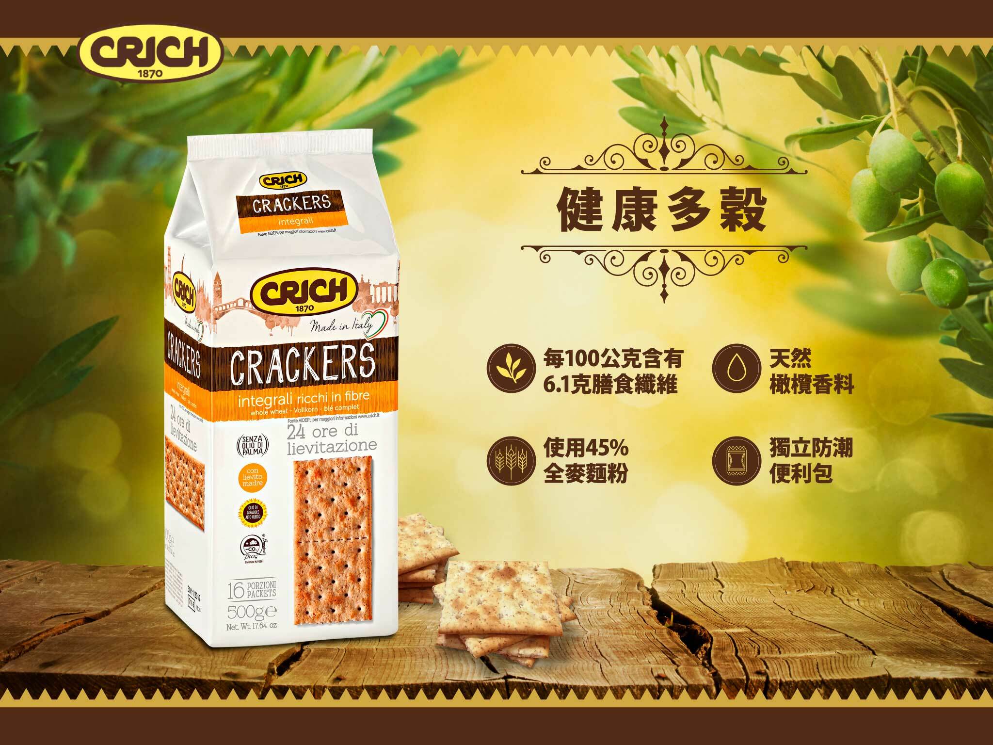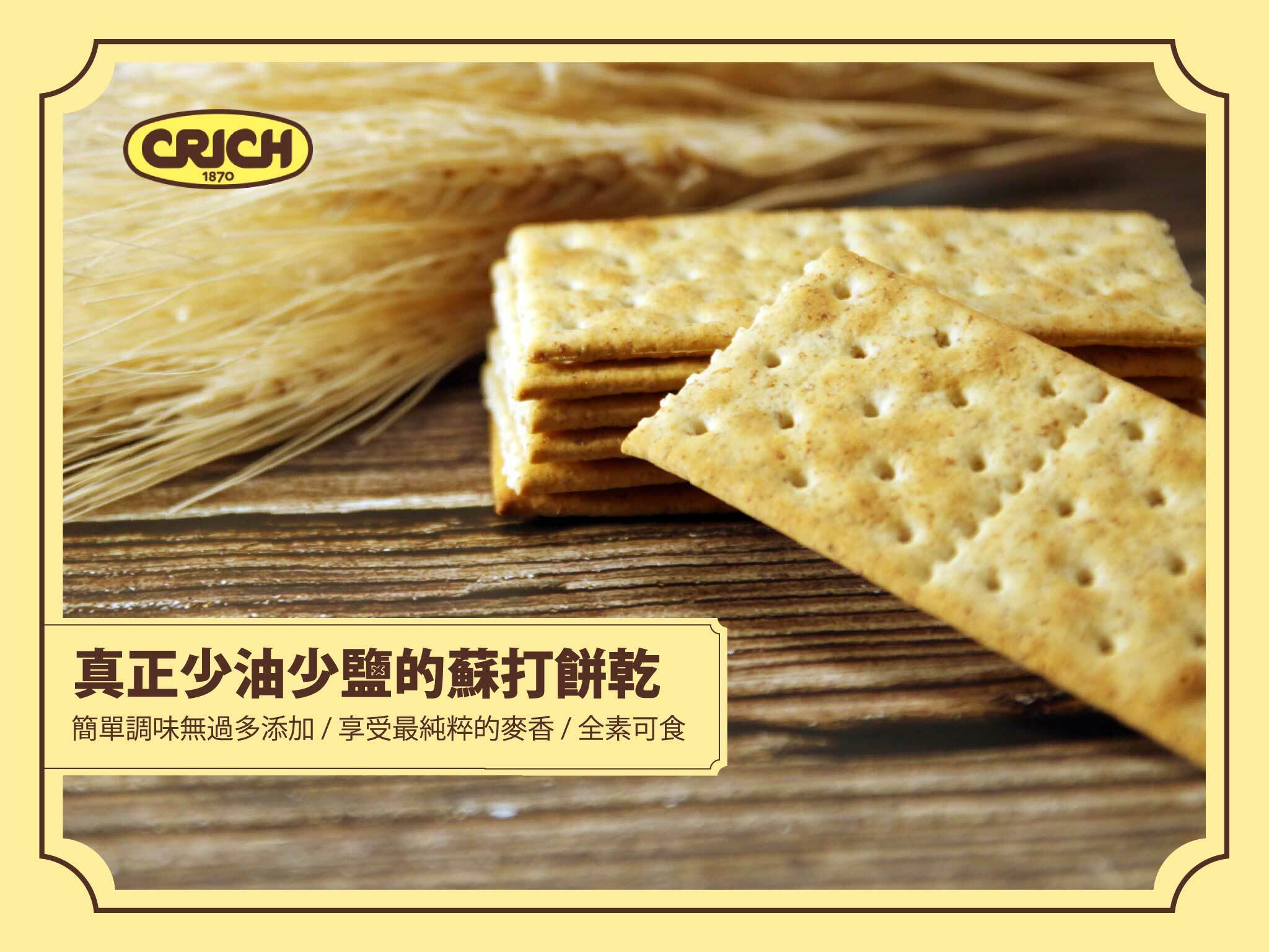 義大利原裝進口,來自歐洲最大蘇打餅公司,天然酵母24小時自然發酵,清脆口感、充滿麥子芳香,不含人工色素或防腐劑全素可食