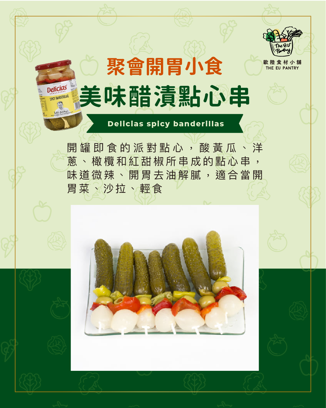 開罐即食的派對點心,酸黃瓜、洋蔥、橄欖和紅甜椒所串成的點心串,味道微辣、開胃去油解膩,適合當開胃菜、沙拉、輕食