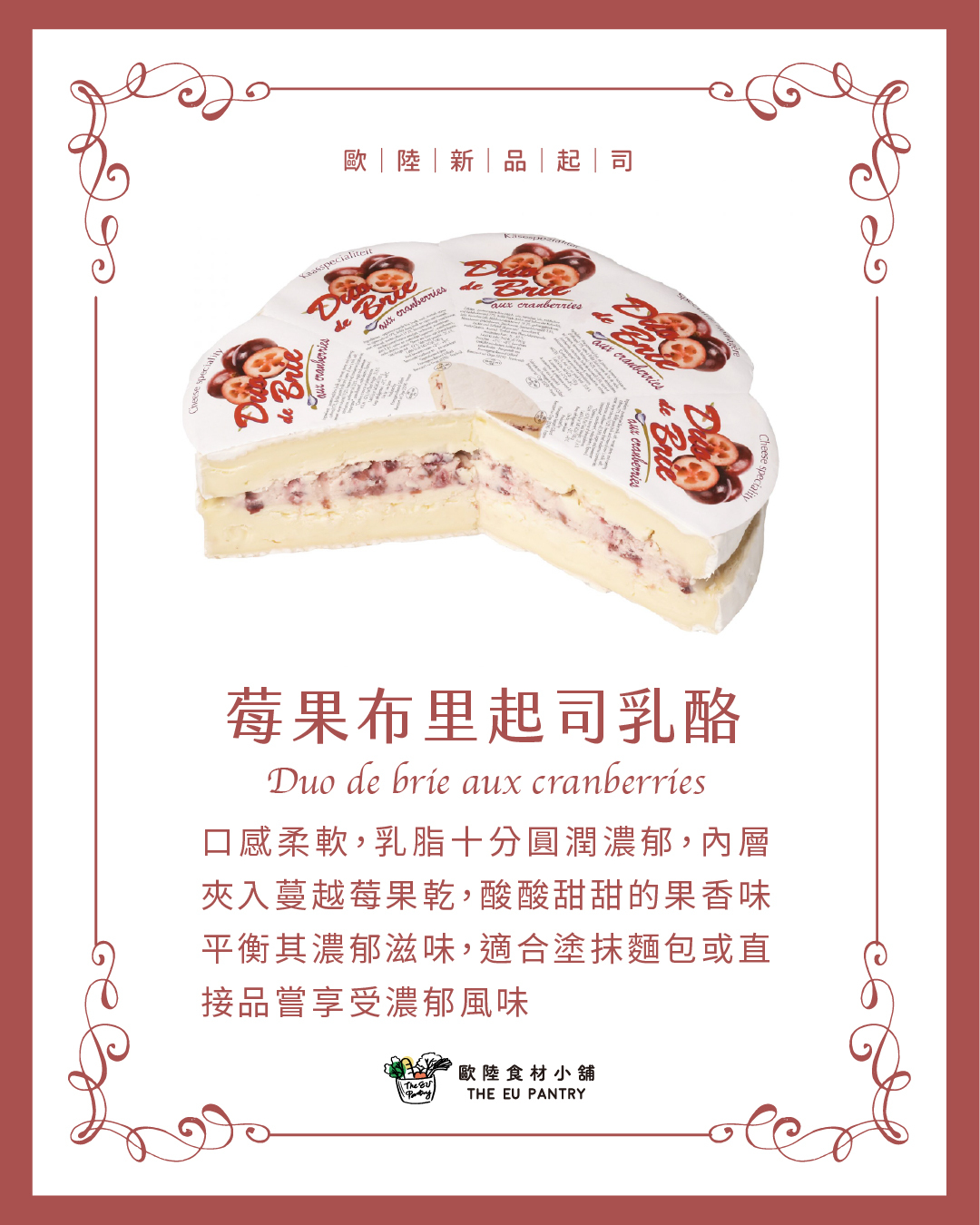 成份: 布里起司乳酪、抹醬(乳脂、乳酪、水、鹽、玉米糖漿)蔓越莓乾(蔓越莓、蔗糖、葵花油)