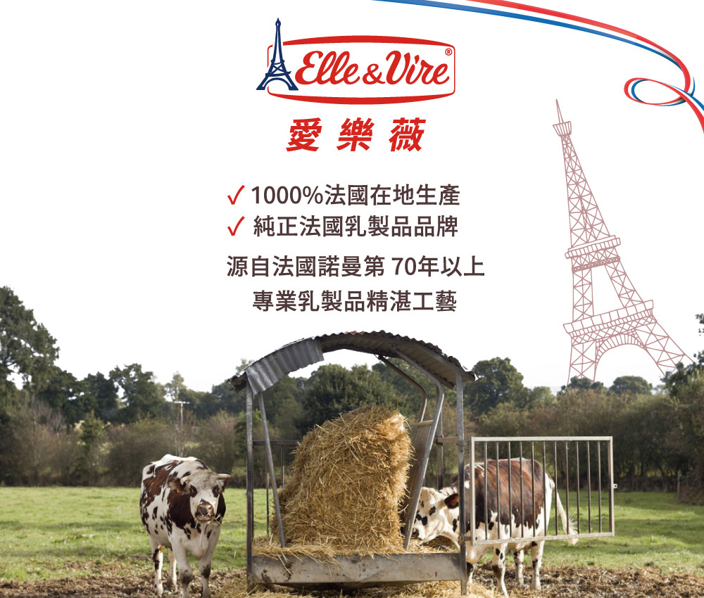 Elle & Vire (愛樂薇) 源自法國諾曼第,肥沃的土壤、溫和的氣候、豐沛的雨量,讓牧草在純淨陽光與吹拂著,帶有礦物質的海風下得以良好的生長。舒適的環境與營養的牧草,讓諾曼第的乳牛生產出優質的新鮮牛乳,聞名於全世界 。而因擁有優質的乳源,發展出獨特的乳品製作工藝,並精益求精,細細發展出其獨特卓越 的乳製品。秉持著讓料理能盡情發揮烹飪的創意,在家就能做出如同主廚們的手藝, Elle & Vire 秉持持續創新,帶給消費者最好的產品 !