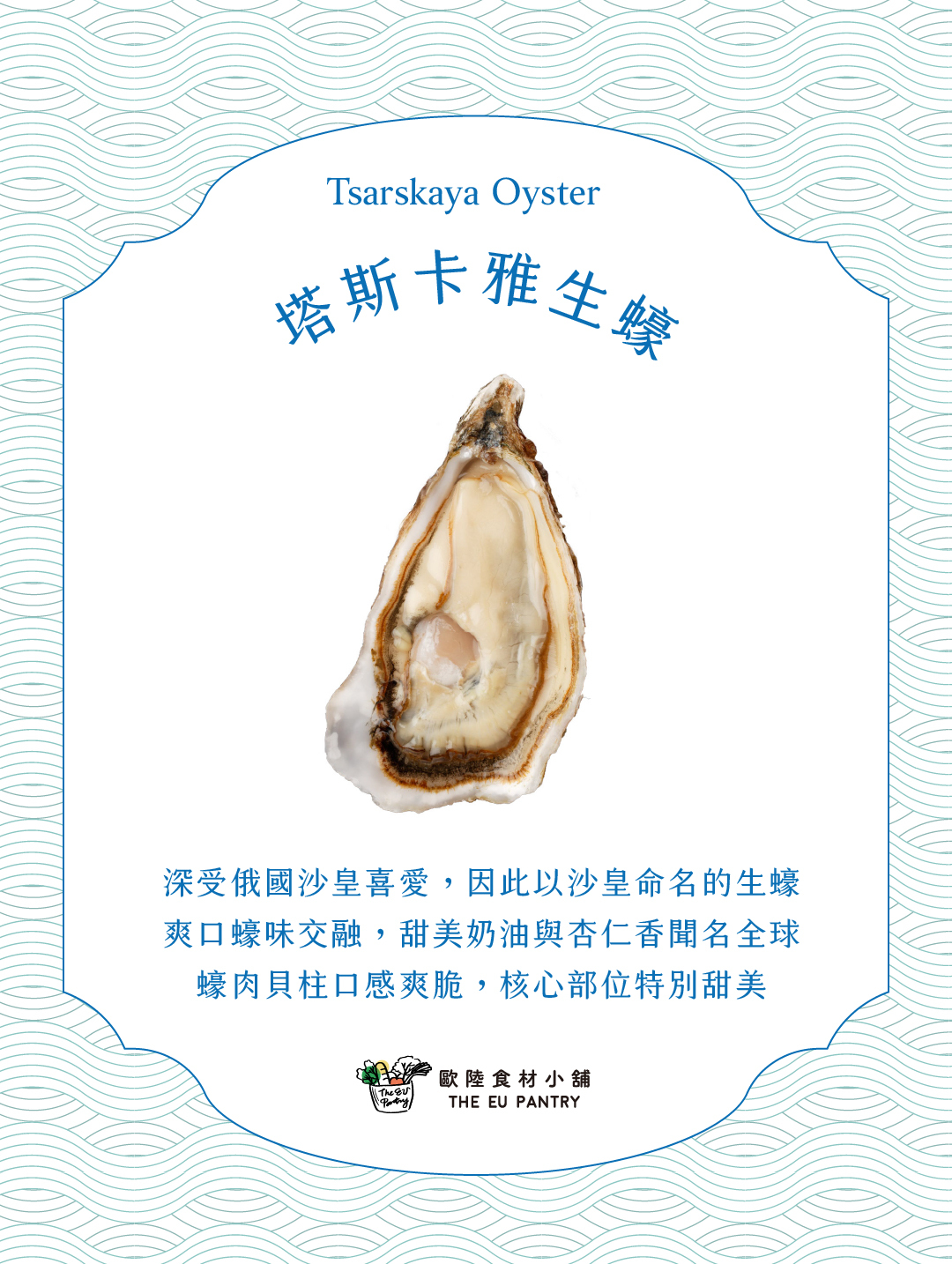 法國塔斯卡亞生蠔Tsarskaya Oyster,其中Tsar字意為俄國沙皇的意思,是早年法國進貢給沙皇的生蠔,故以俄文命名,主要養殖於法國布列塔尼區,以爽口蠔味交融甜美奶油與杏仁香聞名全球,蠔肉貝柱口感爽脆核心部位特別甜美