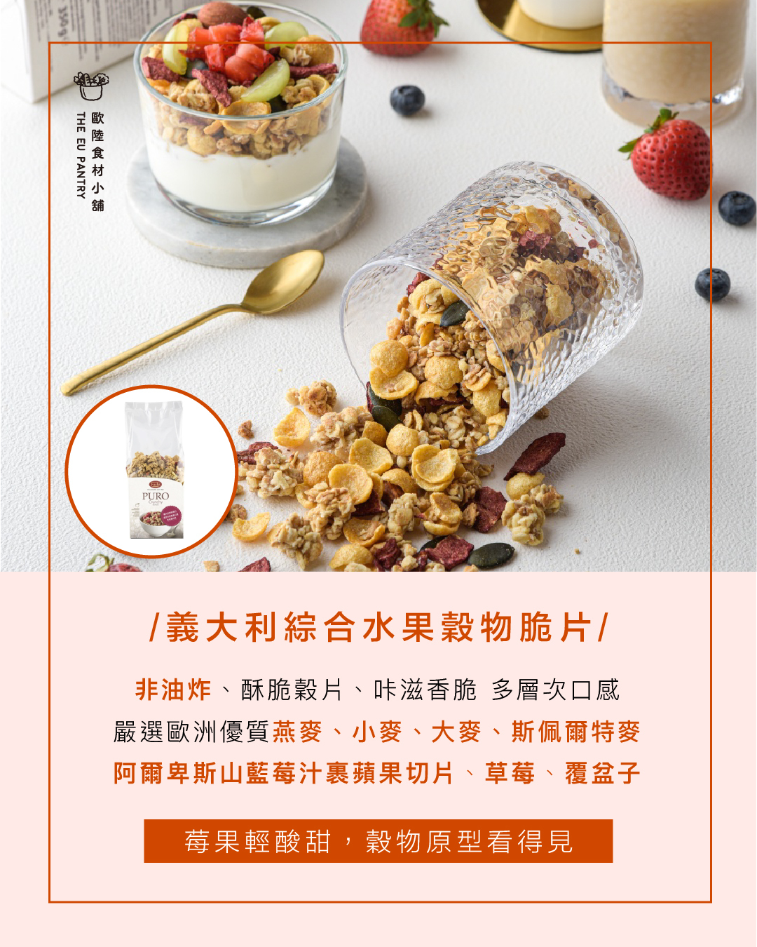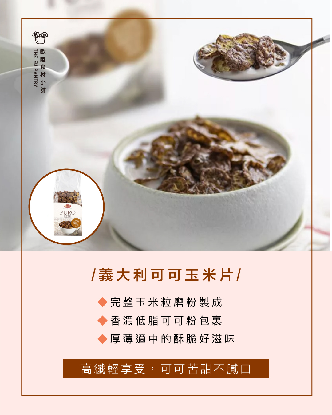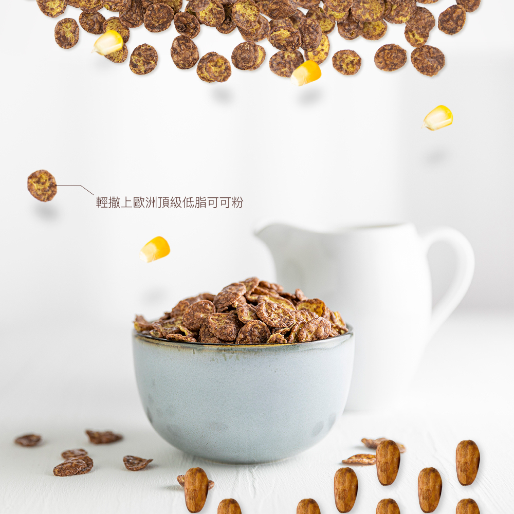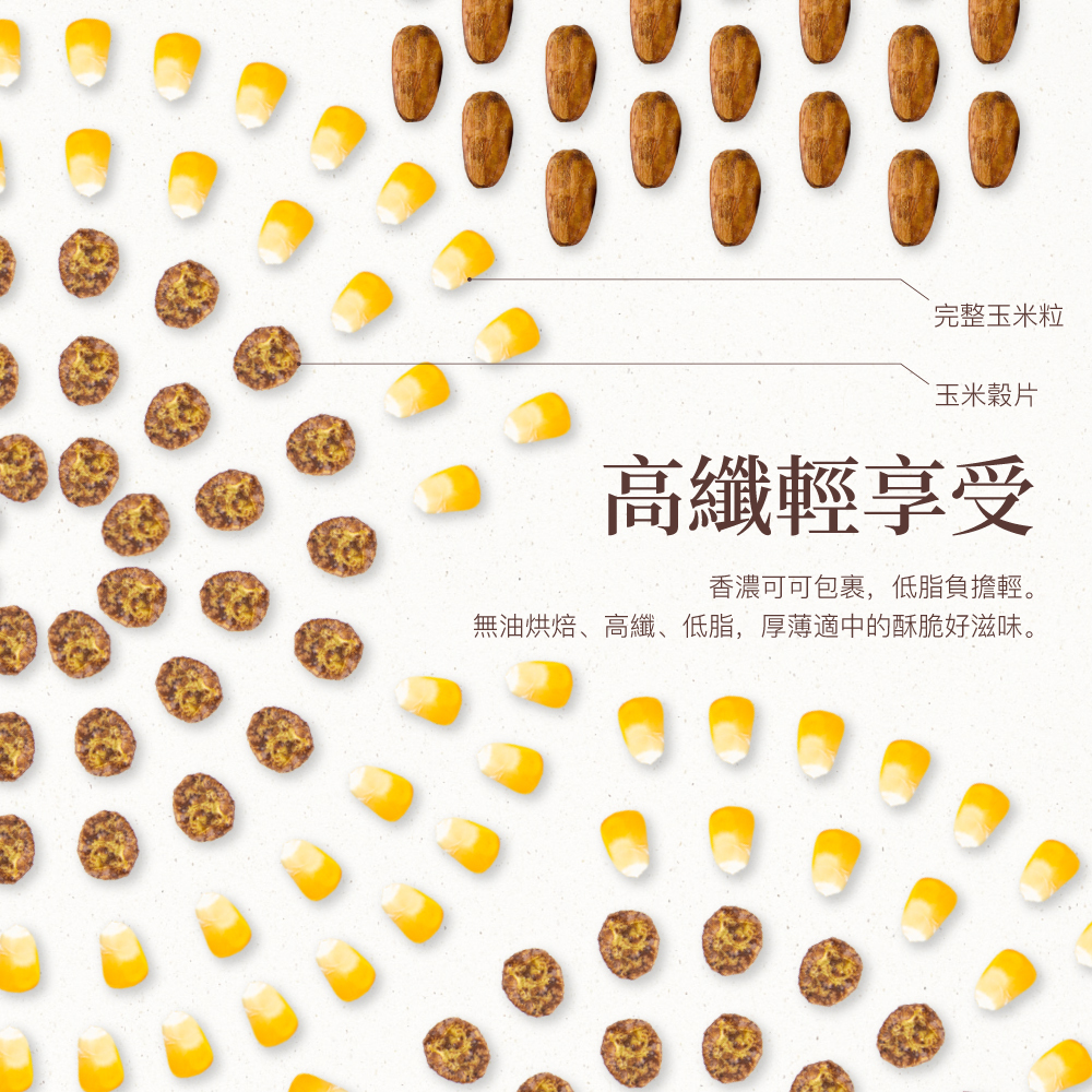 由完整玉米粒磨粉製成,包裹歐洲優質低脂可可粉,苦甜不膩口,健康高纖,早餐、零食的好選擇