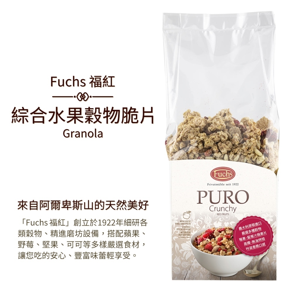 「Fuchs 福紅」創立於1922年細研各類穀物、精進磨坊設備,搭配蘋果、野莓、堅果、可可等多樣嚴選食材,讓您吃的安心、豐富味蕾輕享受。