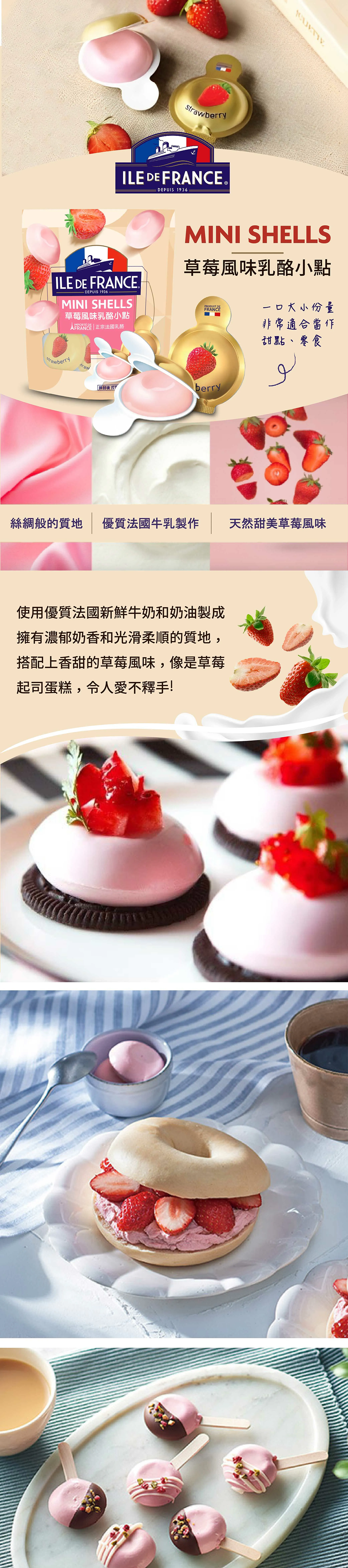 由法國優質生牛奶和奶油製成,具有絲綢般的質地與滑順口感,嚐起來如同草莓起司蛋糕一口大小剛剛好,輕鬆隨時食用;非常適合當作甜點、零食或開胃菜擺盤!