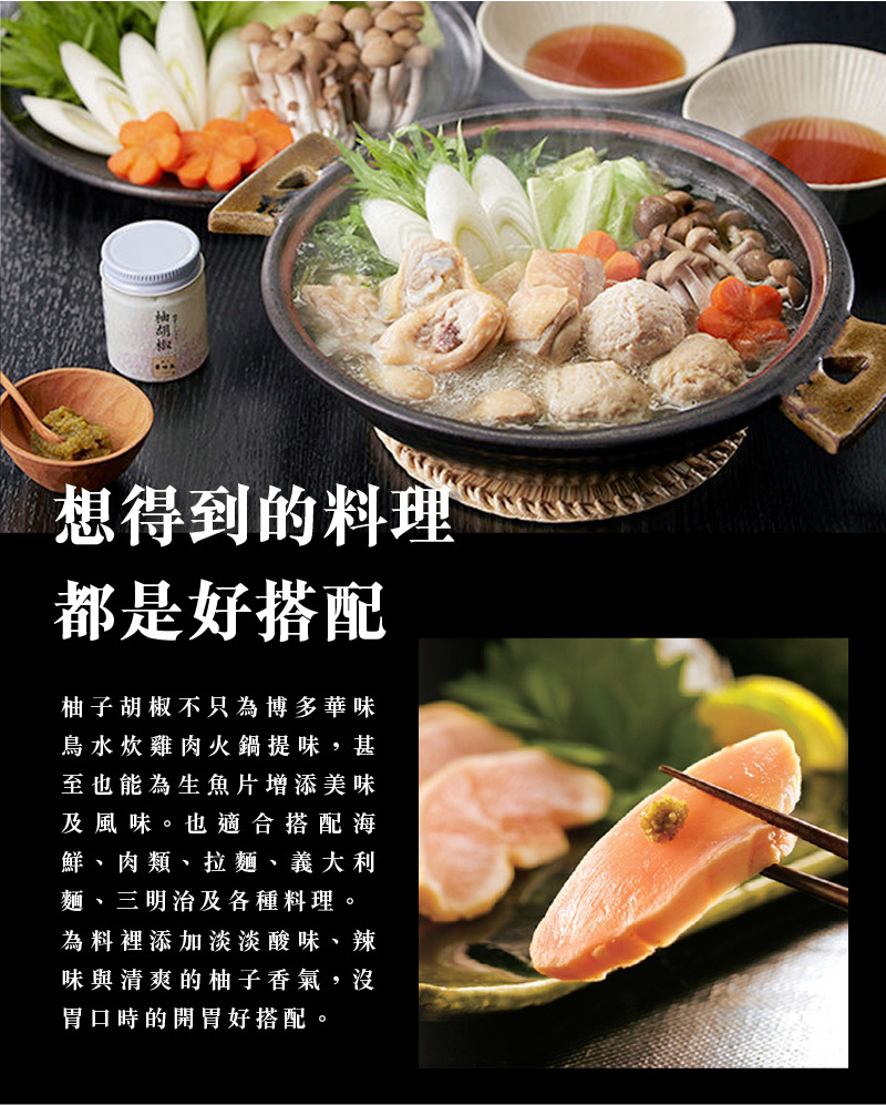 可為料理增添淡雅酸味、辣味與柚香,清爽開胃,百搭各式料理,常用於雞肉火鍋、生魚片、拉麵、肉類
