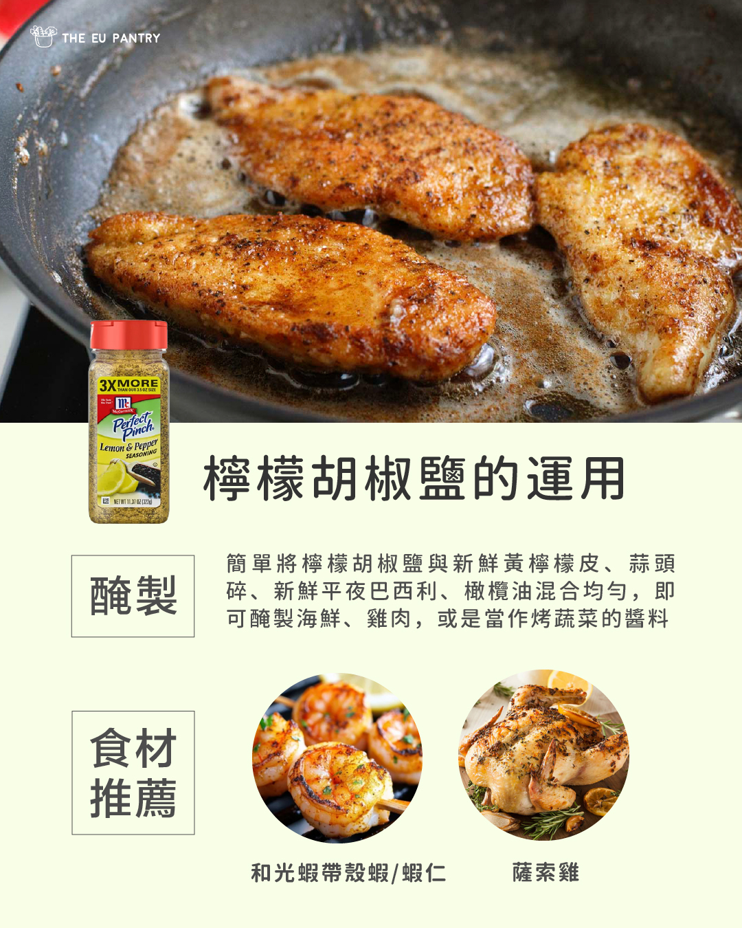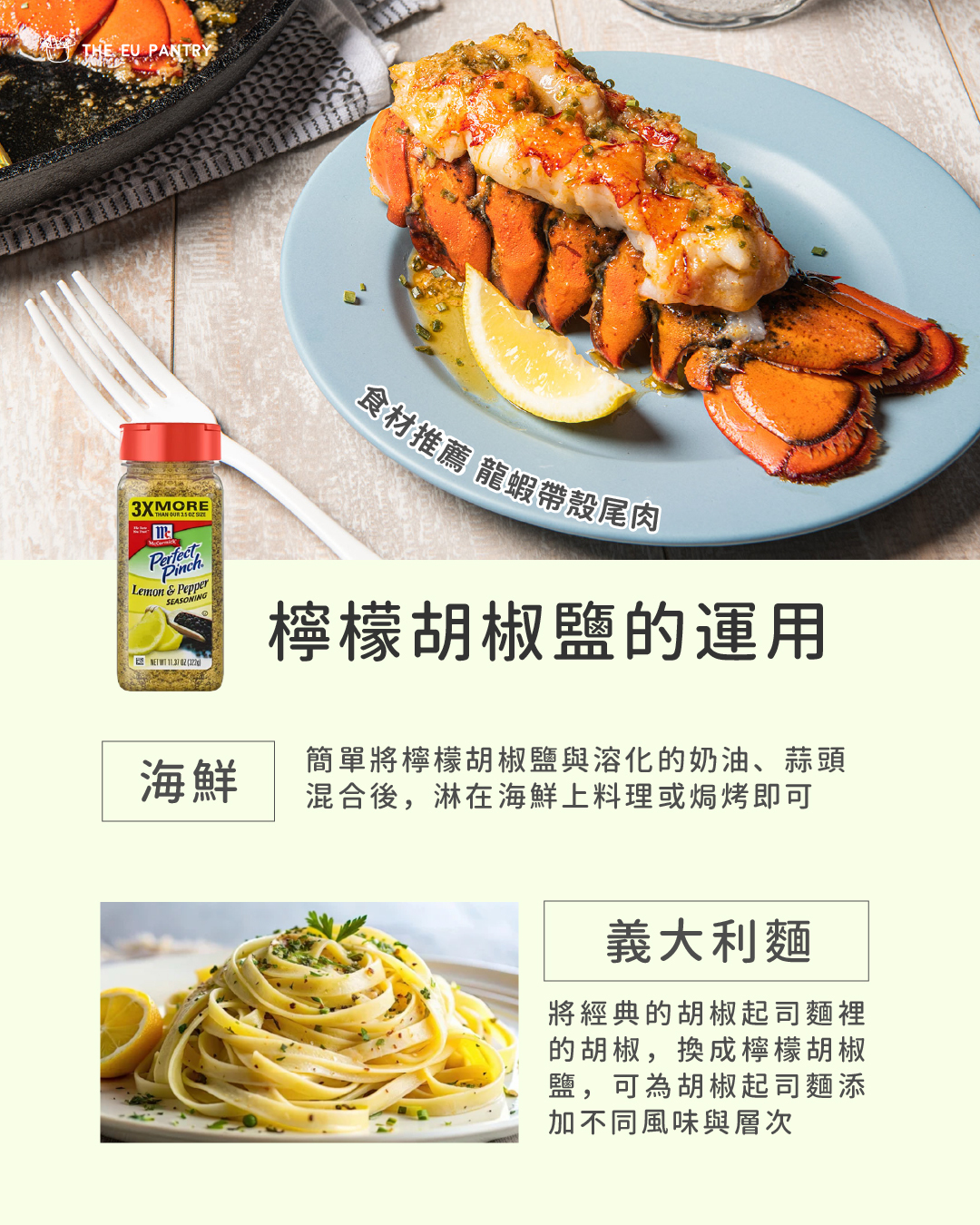適合各種蔬菜、白肉類、海鮮及沙拉,亦可將奶油溶化後加入一些檸檬胡椒粉直接淋在海鮮上蒸煮或燒烤。