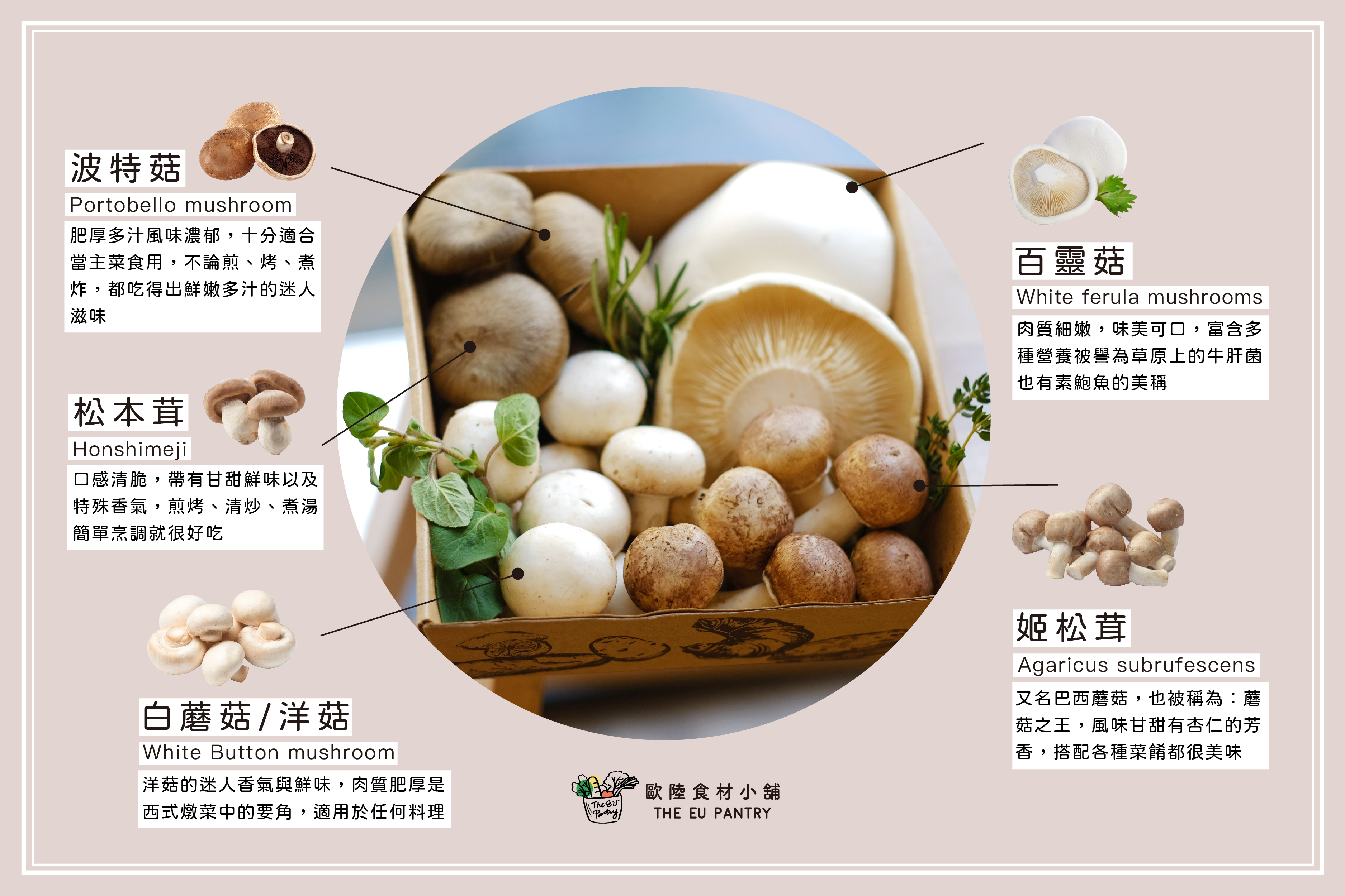 歐陸小舖精選台灣在地新鮮菇類,可同時享受不同菇類的風味與口感