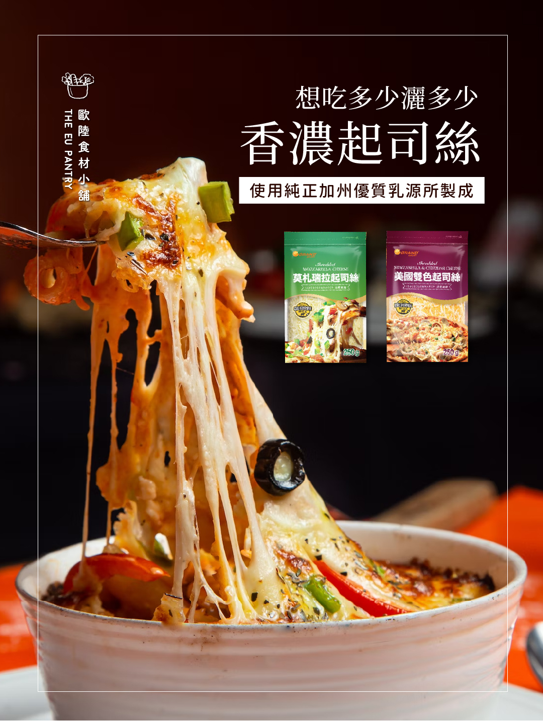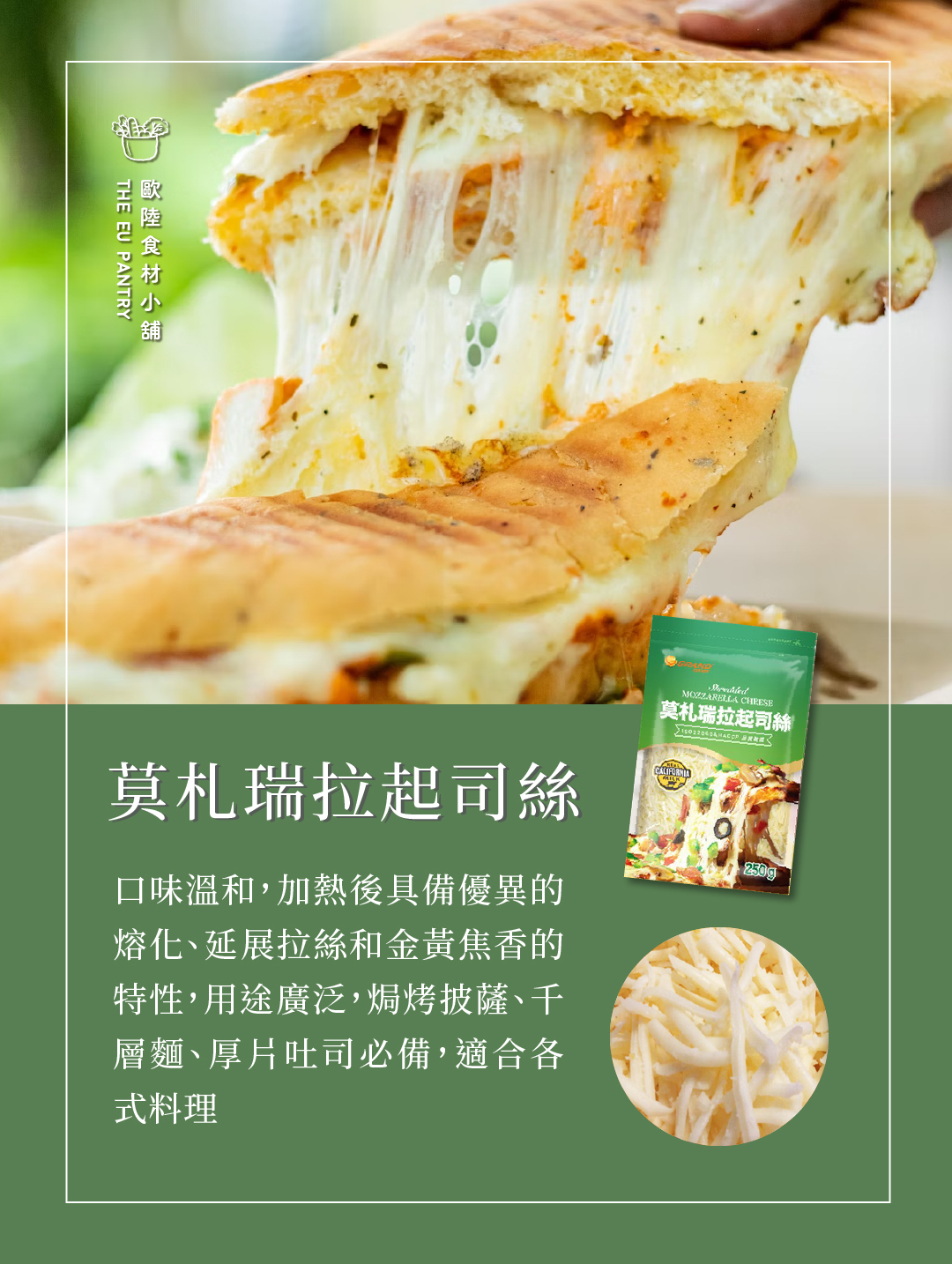 口味溫和,加熱後具備優異的熔化、延展(拉絲)和金黃焦香的食材特性,因此用途廣泛並適合各式各樣的烹飪、烘焙...等廚藝調理。「GRAND DAIRY®莫札瑞拉起司絲」使用上非常方便,適用於加強濃稠口感的美食表現,如需要醬料包裹的PASTA麵條、熔岩爆漿般流淌的餡料或拉絲快感的起司夾心...都非常適合