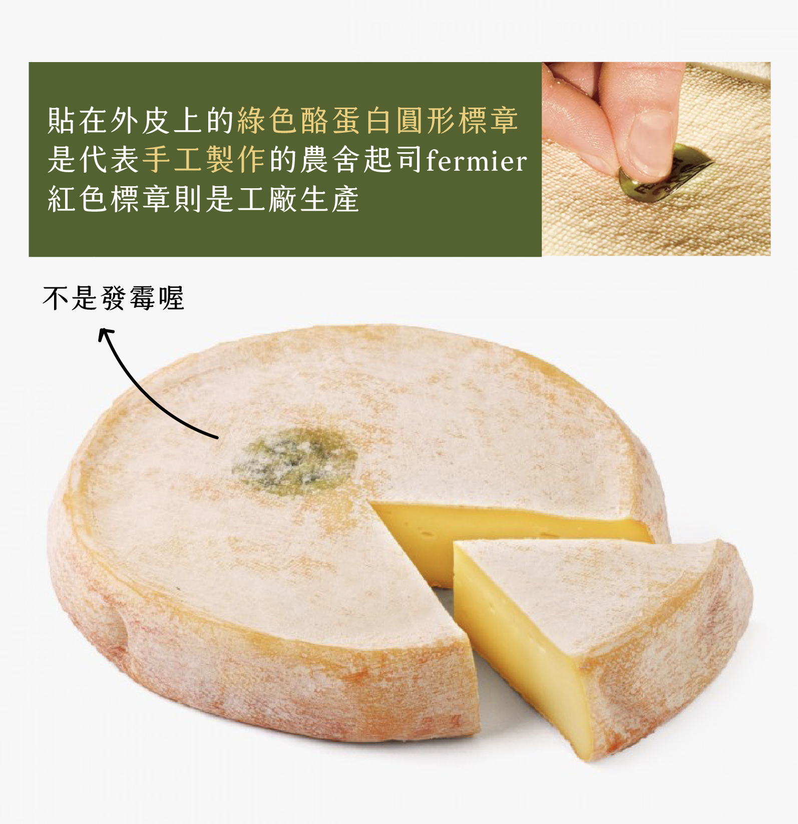 2. 等級可在起司上看到標章,貼在外皮上的圓形綠色酪蛋白標章,代表這是農舍起司,紅色標章代表是工業化工廠生產