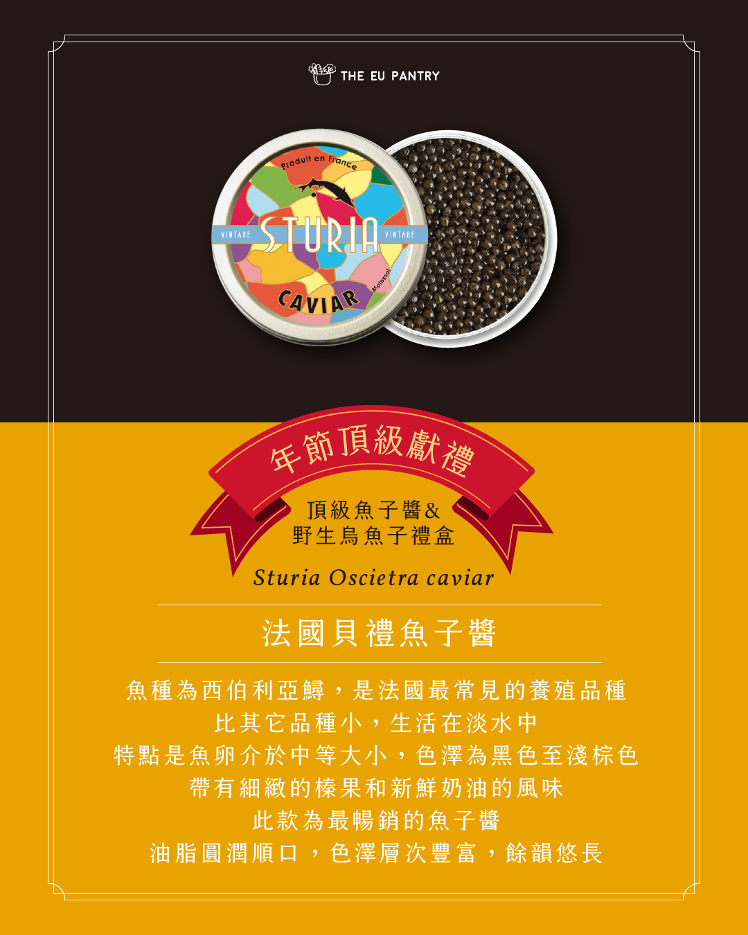 詩圖麗亞是法國著名魚子醬生產商STURGEON的旗艦品牌,20年前於波爾多附近創立,在法國率先開展了鱘魚養殖事業,詩圖麗亞每年生產約12噸魚子醬,銷往世界各地推動法國美食的國際影響力。