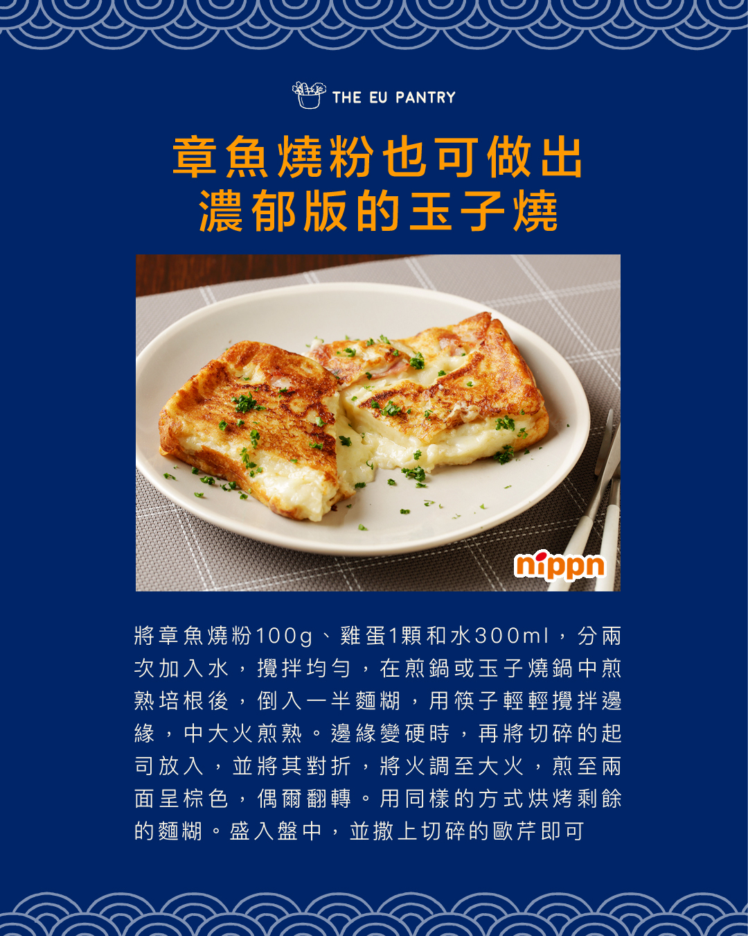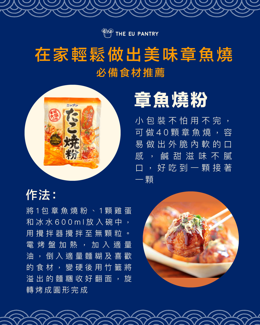 1包可做40顆章魚燒,鹹甜滋味不膩口。作法:將章魚燒粉、雞蛋和冰水放入碗中,用攪拌器攪拌至無顆粒。將烤模加熱,加入適量油,倒入適量麵糊及食材,變硬後用竹籤將溢出的麵糰收好翻面,旋轉烤成圓形完成