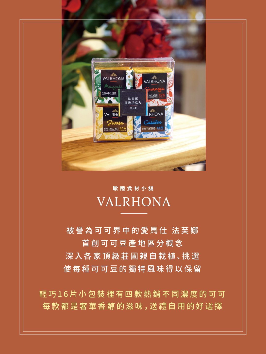 精選熱銷的4款不同濃度的法芙娜巧克力(Guanaja 70%, Caraibe 66%, Manjari 64%, Jivara 40%)