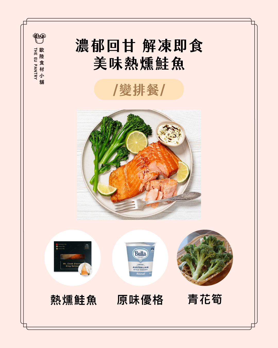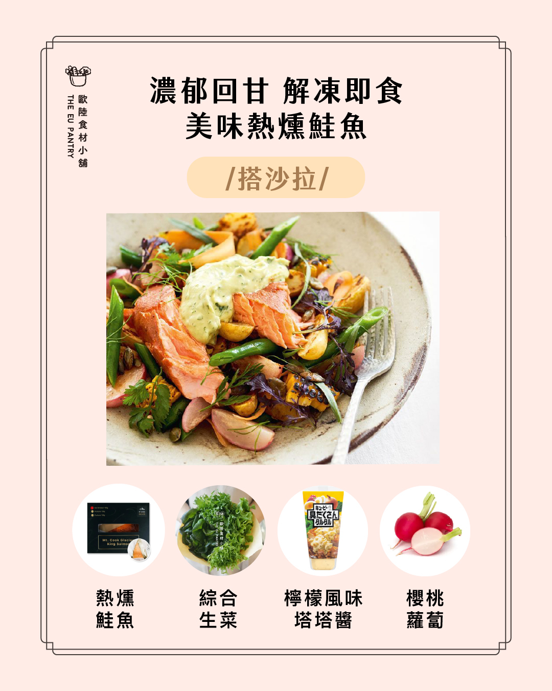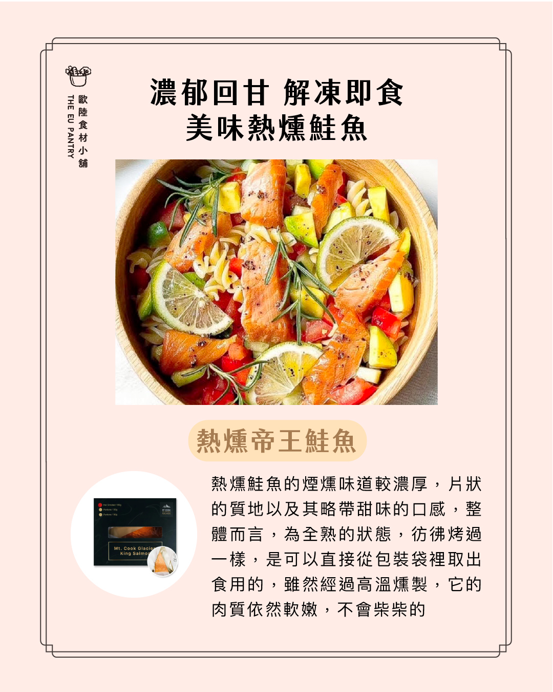 料理搭配建議:在使用方式上, 它的片狀質地非常適合意大利麵,日式蛋捲, 飯糰或炒菜等熱菜。 而我們熱燻帝王鮭魚的優勢就是, 雖然經過高溫燻製, 它的肉質依然軟嫩, 不會像其他的產品一樣柴柴的.