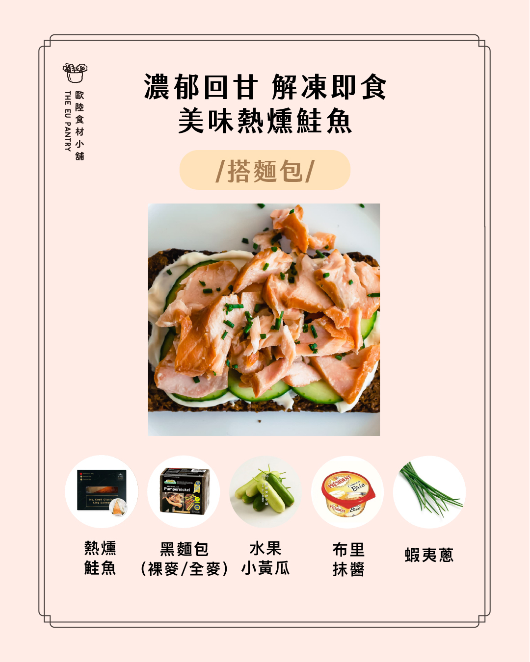 風味:熱燻鮭魚的煙燻味道較濃厚,片狀的質地以及其略帶甜味的口感, 整體而言, 為全熟的狀態,彷彿烤過一樣, 是可以直接 從包裝袋裡取出食用的.