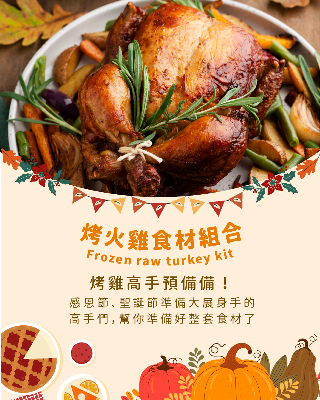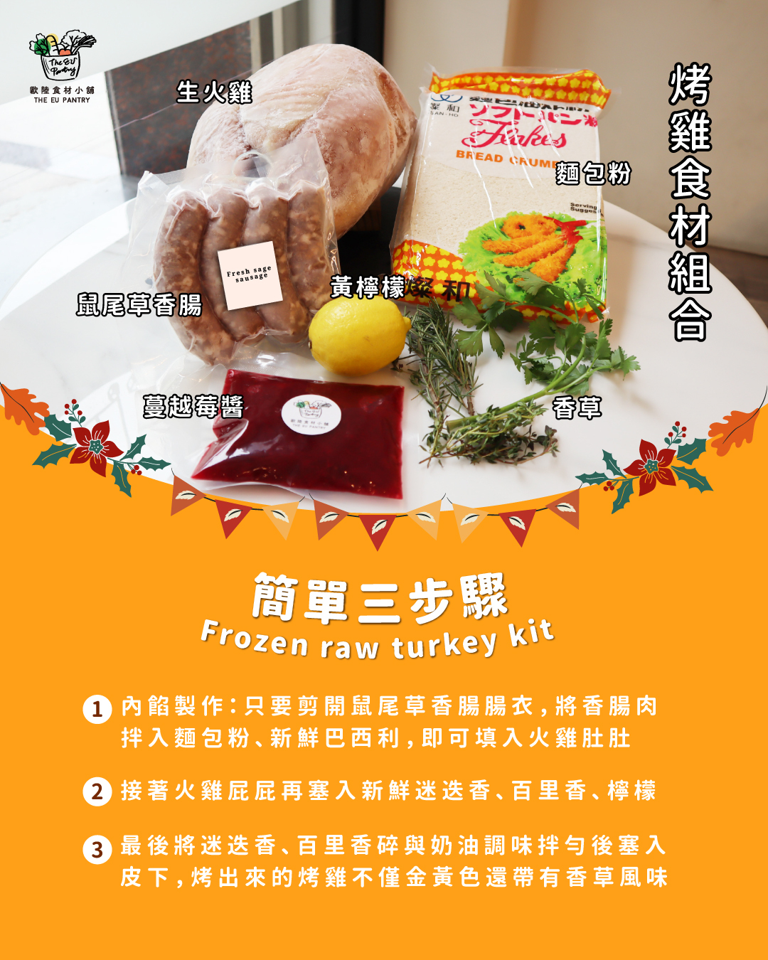 內含生火雞1隻、鼠尾草香腸1包、 麵包粉1包、新鮮巴西利1盒 、百里香1盒、迷迭香1盒 、黃檸檬1顆 、蔓越莓醬1包、藍斯可無鹽奶油1條