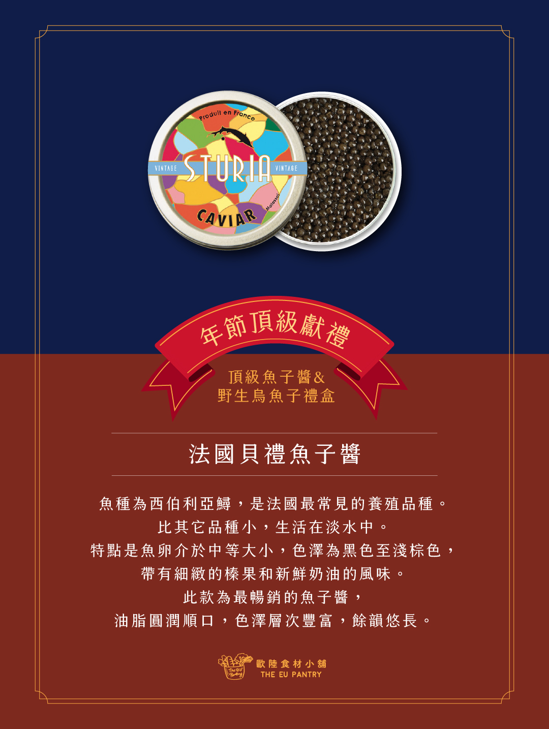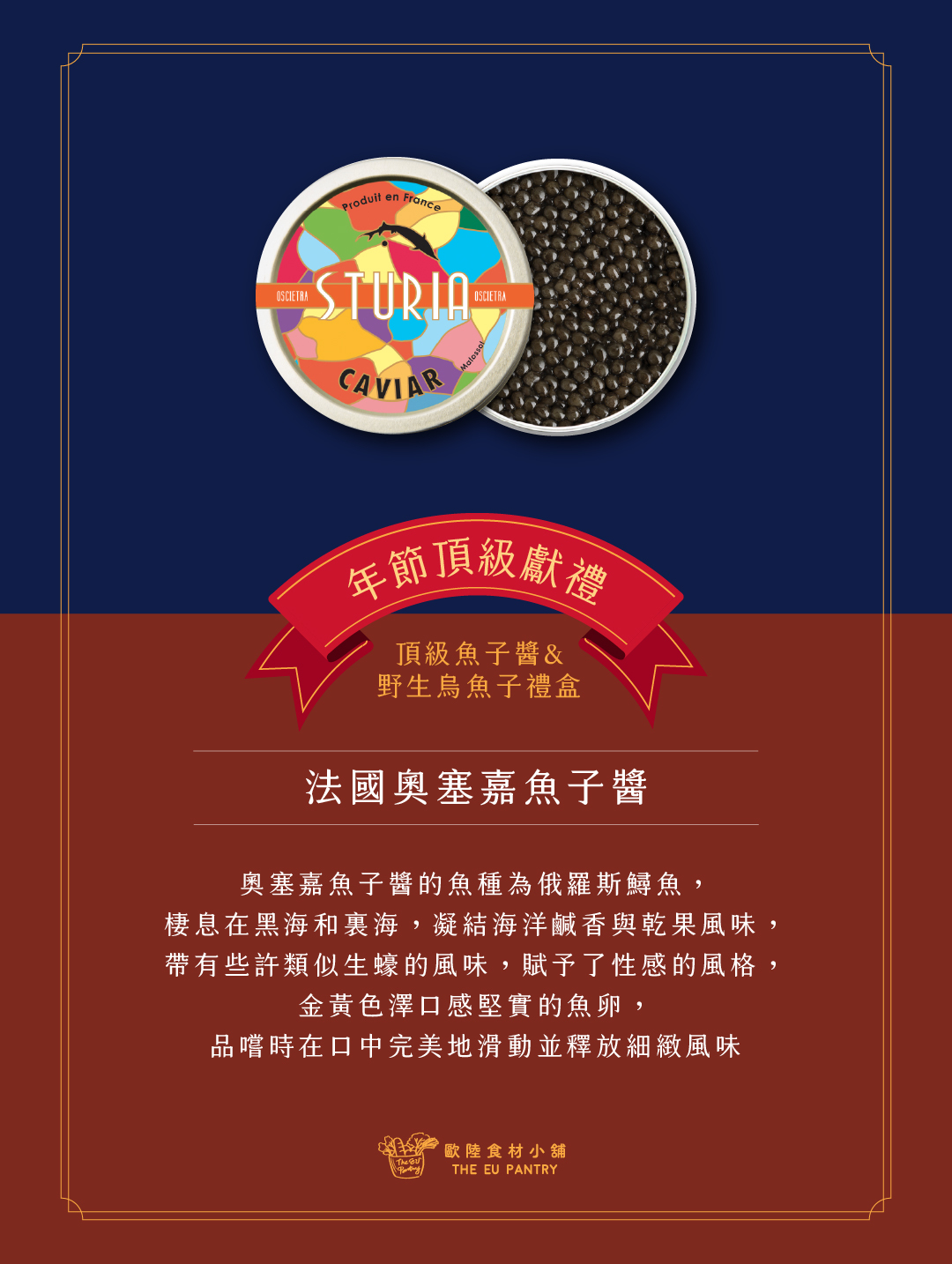 結合東西風味,圓潤飽滿富有油脂的魚子醬與濃郁鹹香黏牙的烏魚子,東西頂級魚卵的美味滿足舌尖雙重享受,與親朋好友分享東西方最好的時節珍品傳達雙份心意