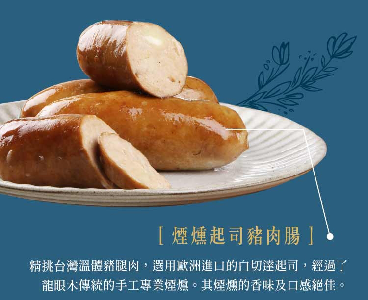 精挑台灣溫體豬腿肉,選用歐洲進口的白切達起司,經過龍眼木傳統的手工專業煙燻。其煙燻的香味及口感絕佳。