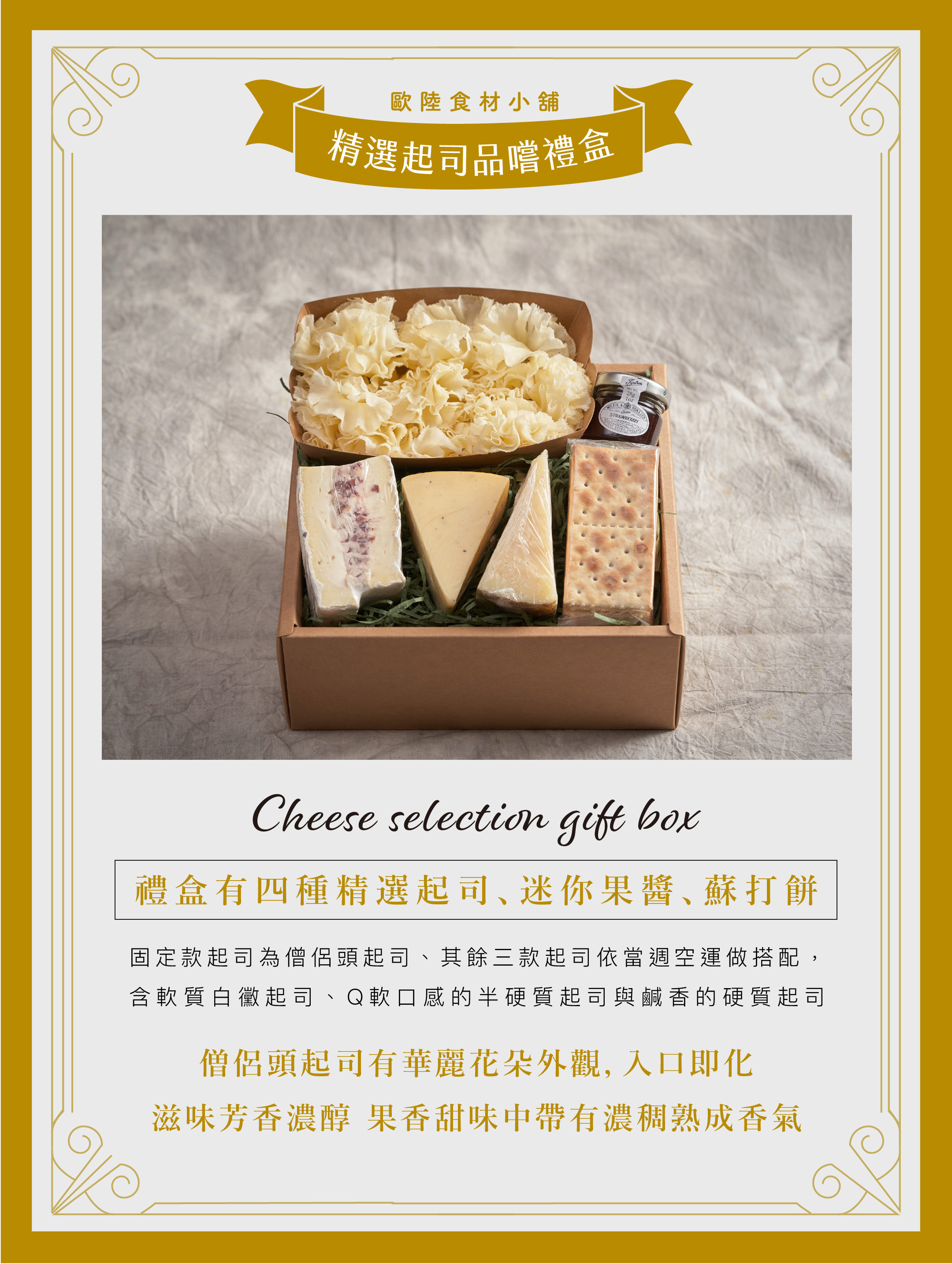 僧侶頭為固定款,其餘三款起司種類會依照當週空運做搭配,含軟質白黴起司、Q軟口感的半硬質起司與鹹香的硬質起司