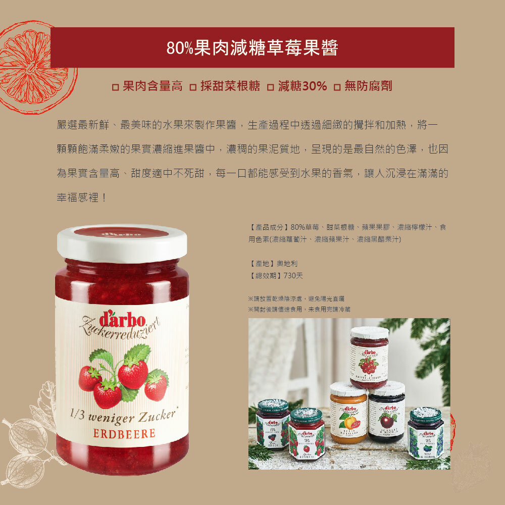相較於一般市面上吃到的普通果醬,D'arbo遵循最傳統的果醬做法,使用最新鮮最好的水果為原料,加上天然的材料,製作出含果量高達70%的果醬。不但能夠當成抹醬塗在麵包上,還能將D'arbo果醬沖調成果茶,當成飲品使用,既天然又美味。如此高品質的果醬,絕對是最佳的選擇