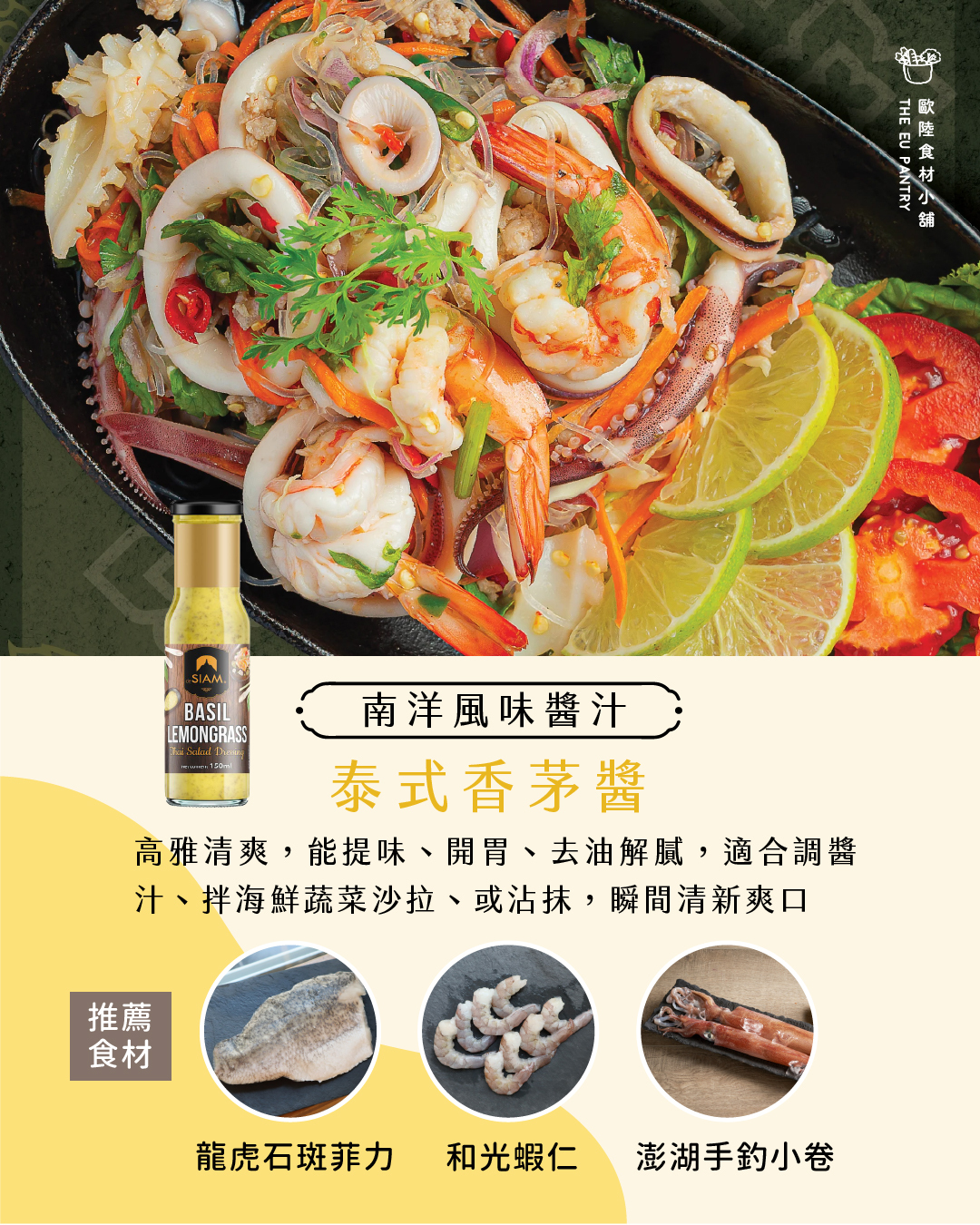高雅清爽的檸檬香味的泰式香茅,適用於風味淡雅的雞肉、花枝、鮮魚、沙拉等白肉類調味醃漬,亦可搭配烤雞及炙烤肉類等,添增食物的風味。