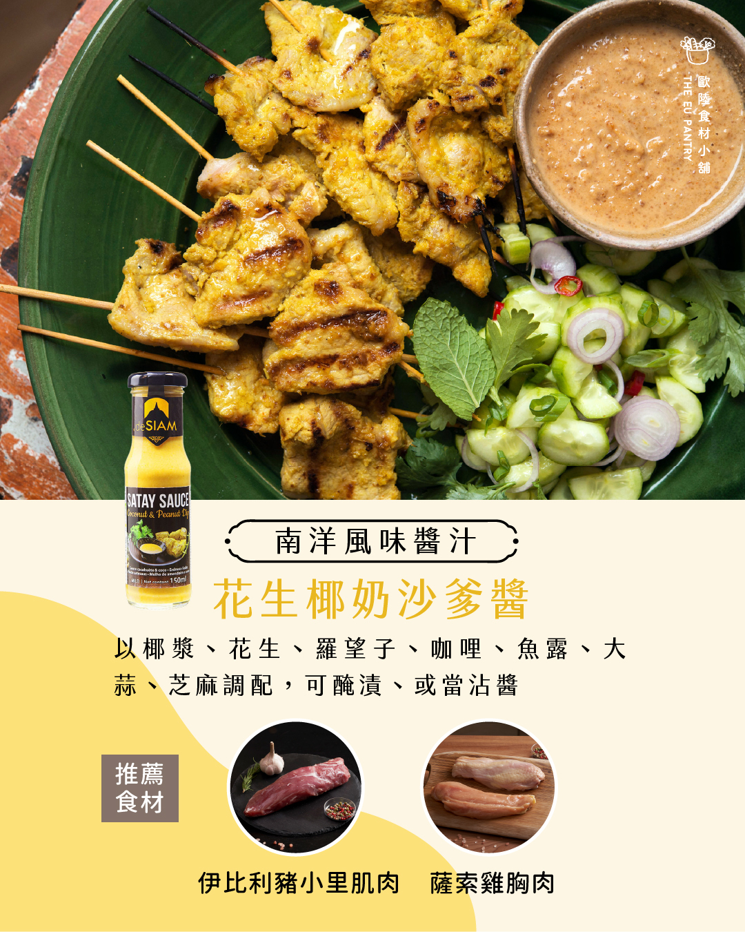 1.以椰漿、花生、羅望子汁、咖哩、魚露、大蒜、芝麻調配出獨特濃郁的泰式風味烤肉醬。