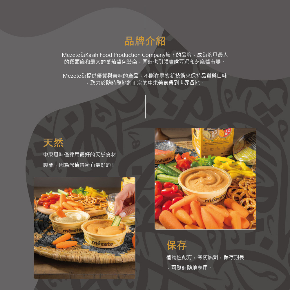 | 成分 | 餅乾:小麥粉、芥花籽油、水、鹽、迷迭香萃取物(抗氧化劑) 鷹嘴豆泥:水、芝麻糊、鷹嘴豆、檸檬酸、鹽、關滑豆膠、迷迭香萃取物(抗氧化劑) |