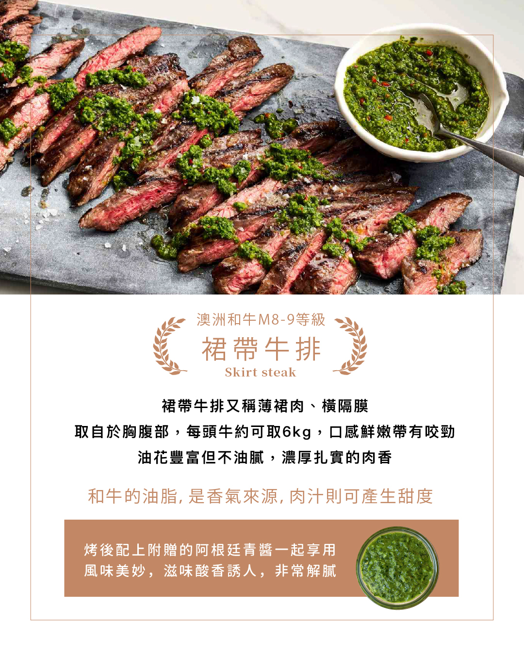 橫隔膜又稱薄裙肉、裙帶牛排skirt steak,取自於胸腹部,每頭牛約可取6kg,口感鮮嫩帶有咬勁,油花豐富但不油膩,咀嚼時可明顯感受到香氣與濃厚扎實的肉香