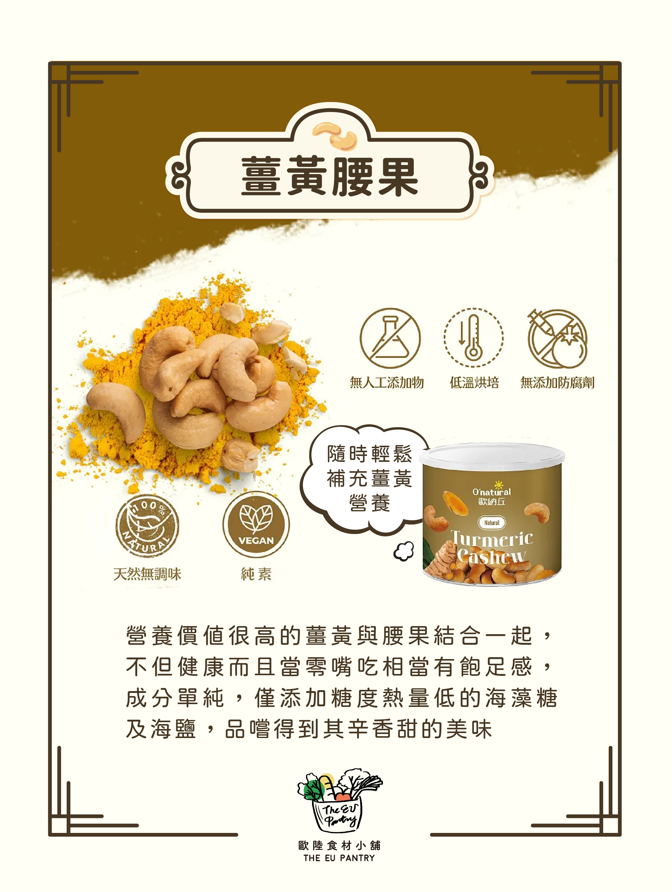 低溫烘烤後加入薑黃,獨特辛香氣味與甘甜清脆可口的腰果融合一起,輕鬆補充薑黃營養,並添加海藻糖使甜度及熱量降低,享受其辛香甜的美味