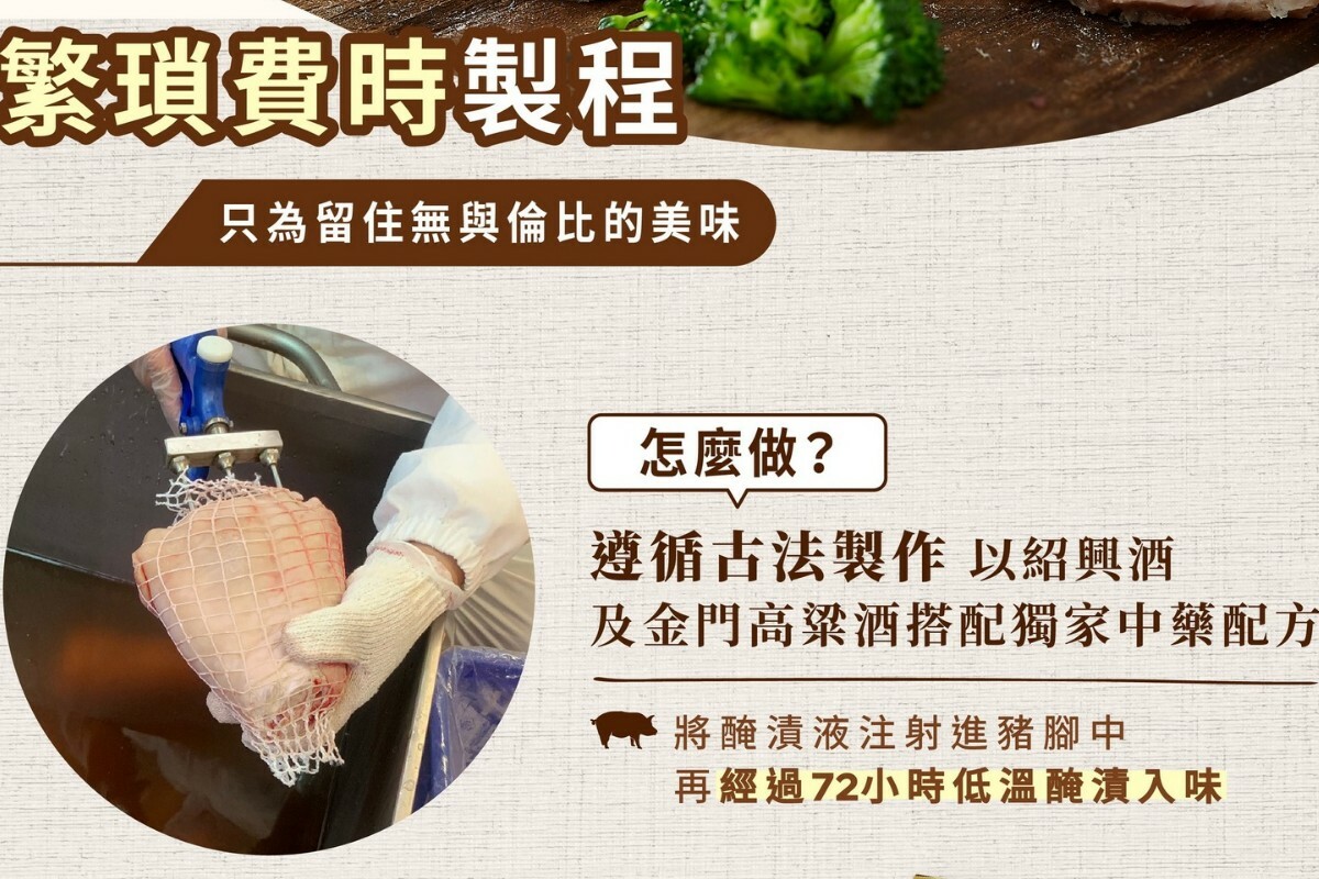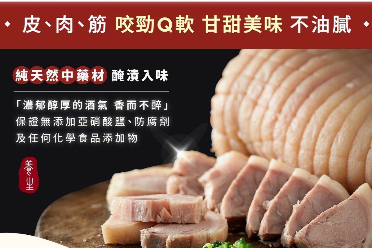 遵循古法製造,獨特中藥配方經近兩小時慢火烹煮,再以精緻中藥材醃漬而成, 紹興酒香濃郁醇厚,甘甜美味不油膩咬勁Q軟