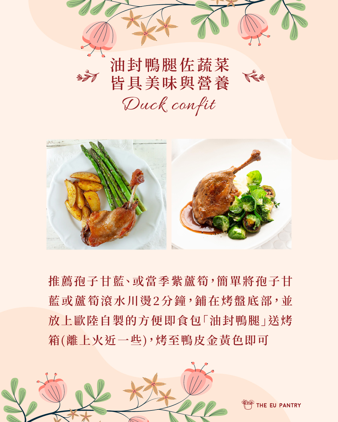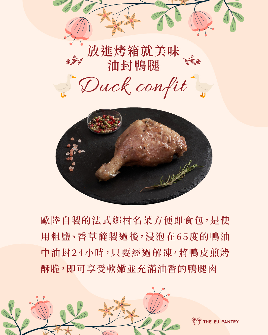 法式鄉村名菜,使用粗鹽、香草醃製過後,浸泡在65度的鴨油中油封24小時,方便即時包只要經過解凍,將鴨皮煎烤酥脆,即可享受軟嫩並充滿油香的鴨腿肉
