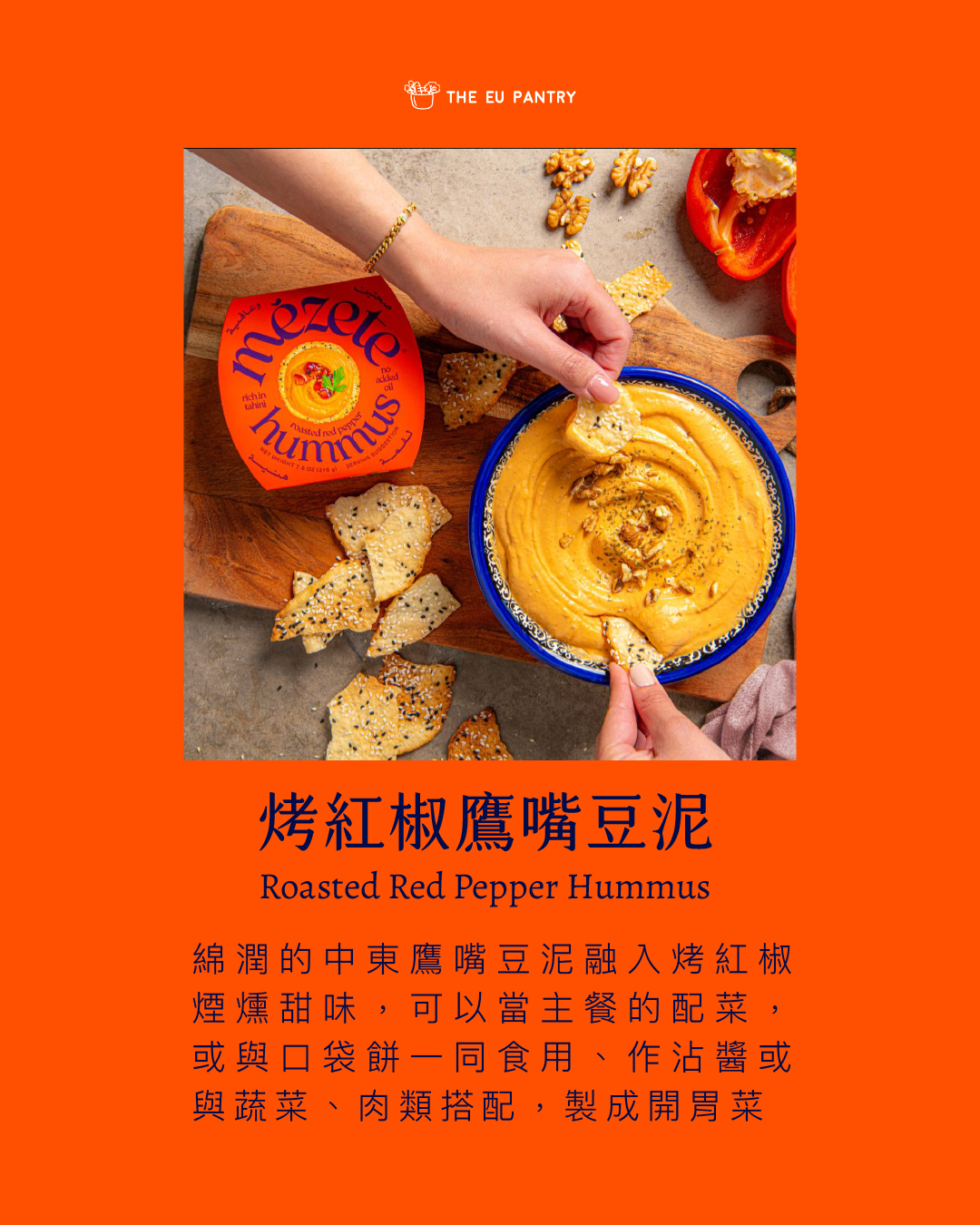 綿潤的中東鷹嘴豆泥融入烤紅椒煙燻甜味,可以當主餐的配菜,或與口袋餅一同食用、作沾醬或與其他配料搭配製成開胃菜