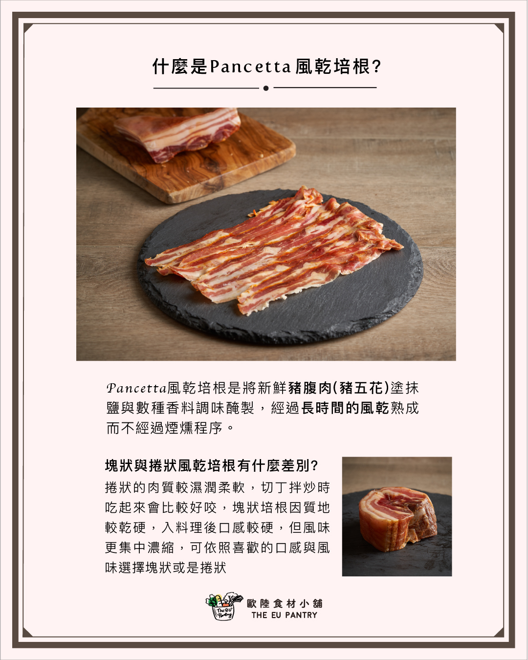 Pancetta 風乾培根是將新鮮豬腹肉(豬五花)塗抹鹽與數種香料調味醃製,經過長時間的風乾熟成而不經過煙燻程序。