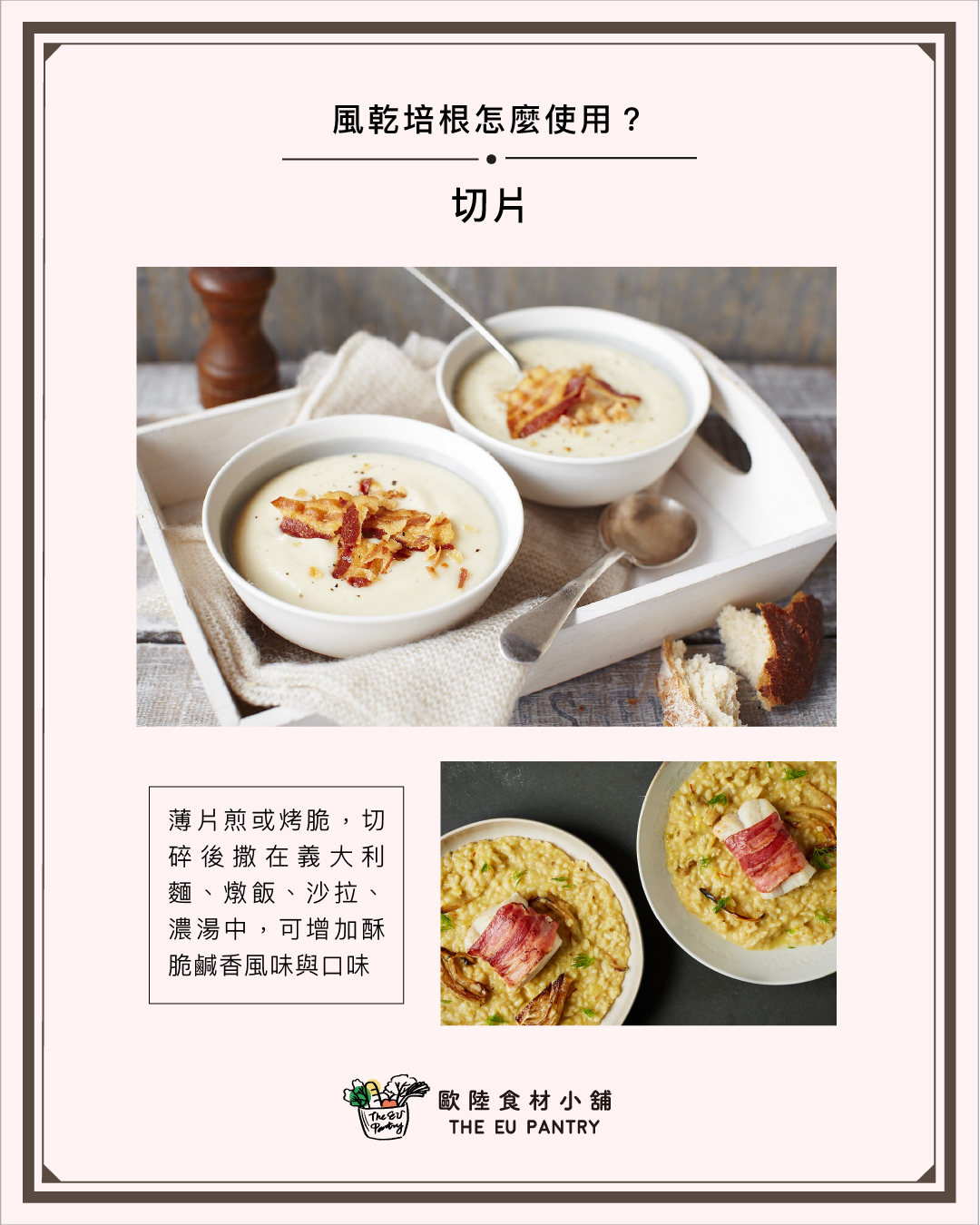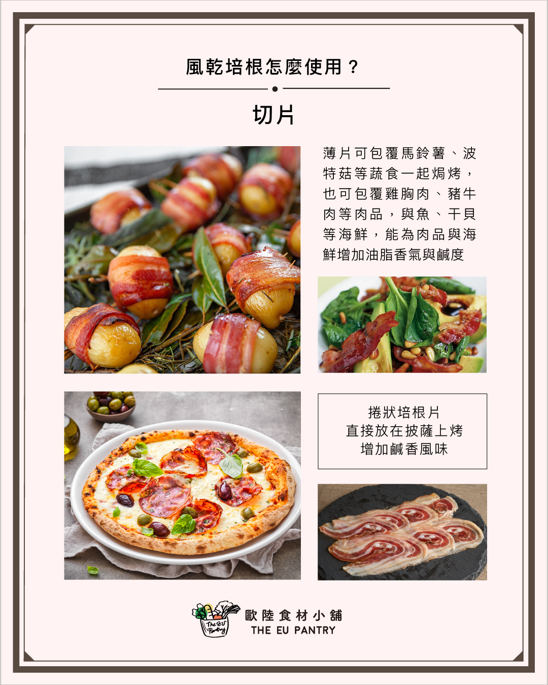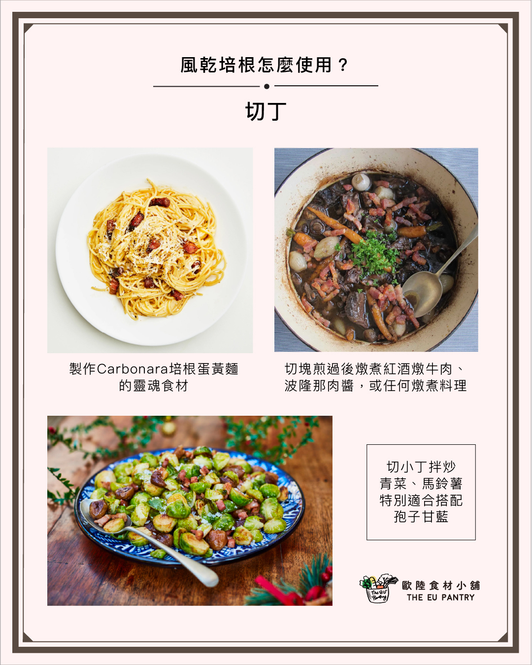 1. 精選豬腹肉至少風乾熟成兩個月,鹹度適中,風味濃郁,帶有豐富的美味油脂,捲狀的肉質更為厚實濕潤,被稱為法國的Pancetta,切片油煎是最傳統且美味的吃法或以片狀包裹雞肉、魚肉進行烘烤;也可煎至焦脆後鋪陳在沙拉上,亦可加入蛋料理、製作義大利麵、燉菜....等,百搭各式料理。