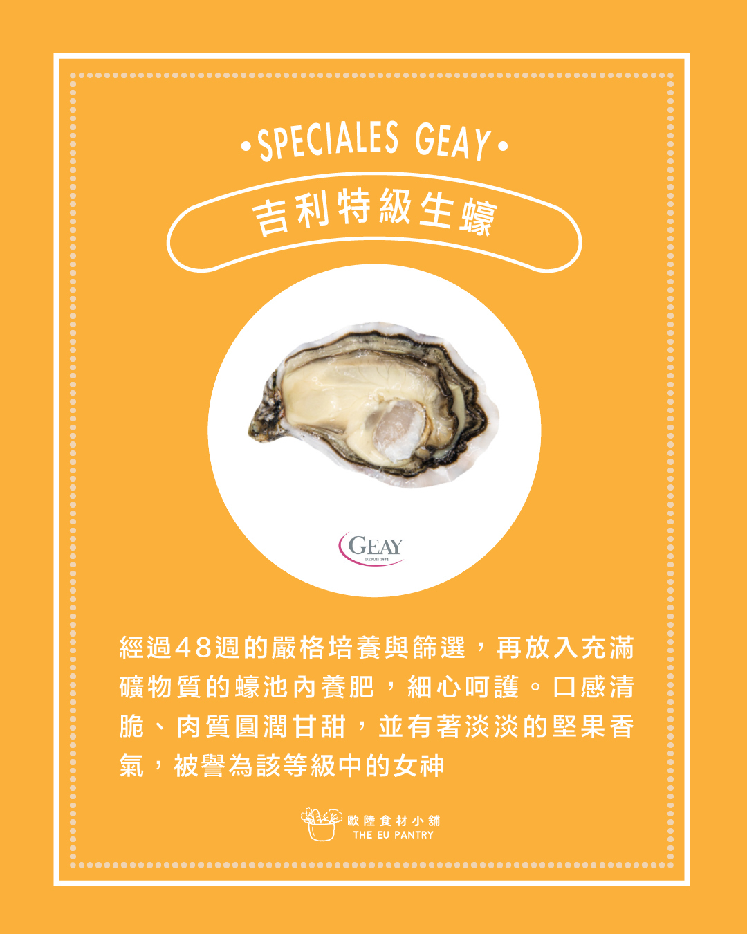 專職養殖生蠔的 Geay 家族,自1874年開始,以高品質生蠔行銷各地,已成為法國知名生蠔品牌,發展至今由第四代 Andrien Geay 負責家族企業。