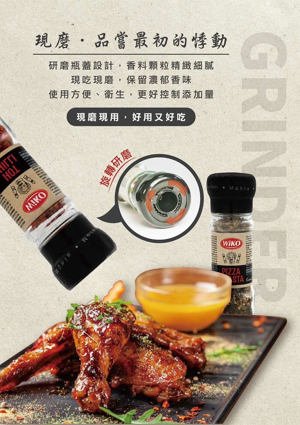 調味研磨罐 – 為料理注入美味靈魂,料理的靈魂在調味,挑對調味料,為簡單料理畫龍點睛,人人都是米其林主廚,Wiko調味研磨罐系列嚴選世界各地優質香料,搭配獨特研磨裝置,讓您享受即時研磨的樂趣,完整保留香料風味,在家也能輕鬆吃到食材的真營養、好味道。