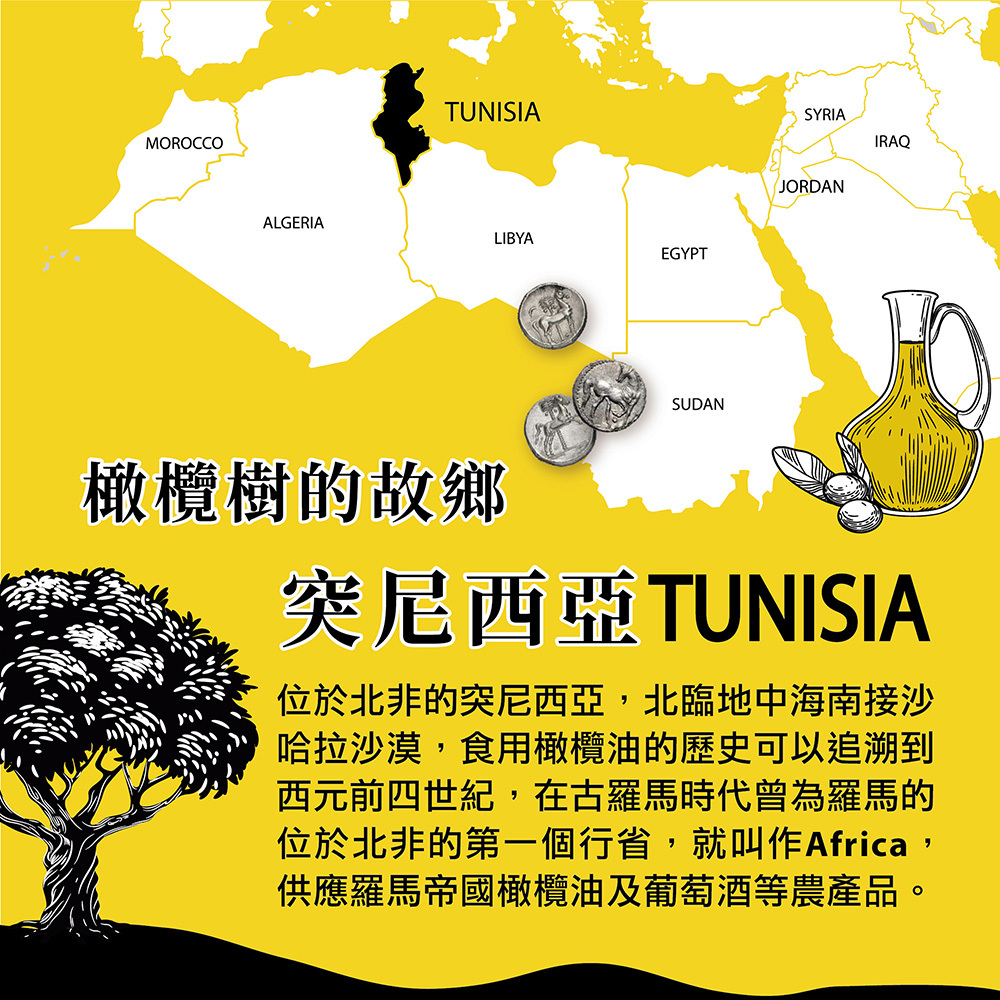 位於北非的突尼西亞,北臨地中海南接沙哈拉沙漠,食用橄欖油的歷史可以追溯到西元前四世紀,在古羅馬時代曾為羅馬的位於北非的第一個行省,就叫作Africa,供應羅馬帝國橄欖油及葡萄酒等農產品。