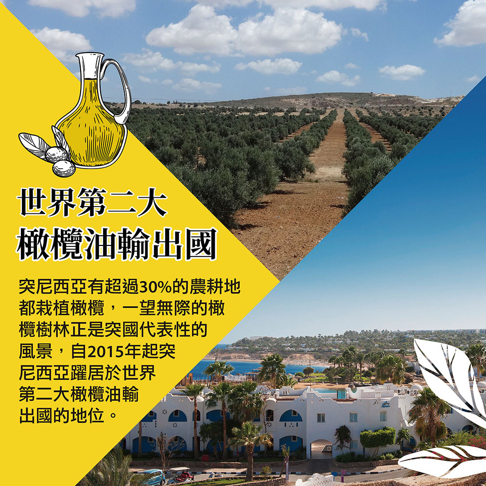 突尼西亞有超過60%的農耕地都栽植橄欖,一望無際的橄欖樹林正是突國代表性的風景,自2015年起突尼西亞躍居於世界第二大橄欖油輸出國的地位
