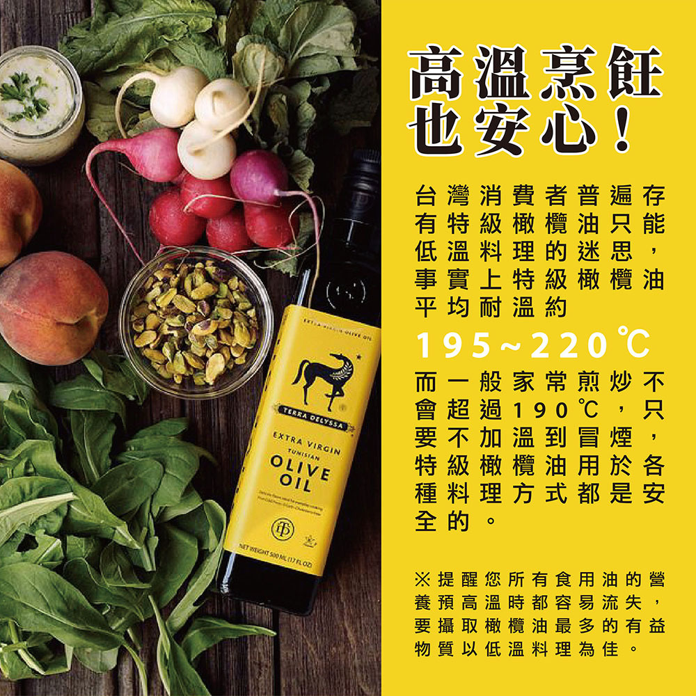 台灣消費者普遍存有特級橄欖油只能低溫料裡的迷思,事實上特級橄欖油平均耐溫約195~220℃,而一般家常煎炒不會超過190℃,只要不加溫到冒煙,特級橄欖油用於各種料理方式都是安全的。