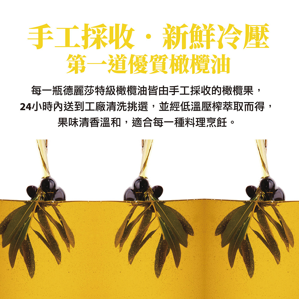 每一瓶德麗莎特級橄欖油皆由手工採收的橄欖果,24小時內送到工廠清洗挑選,並經低溫壓榨萃取而得,果味清香溫和,適合每一種料理烹飪。