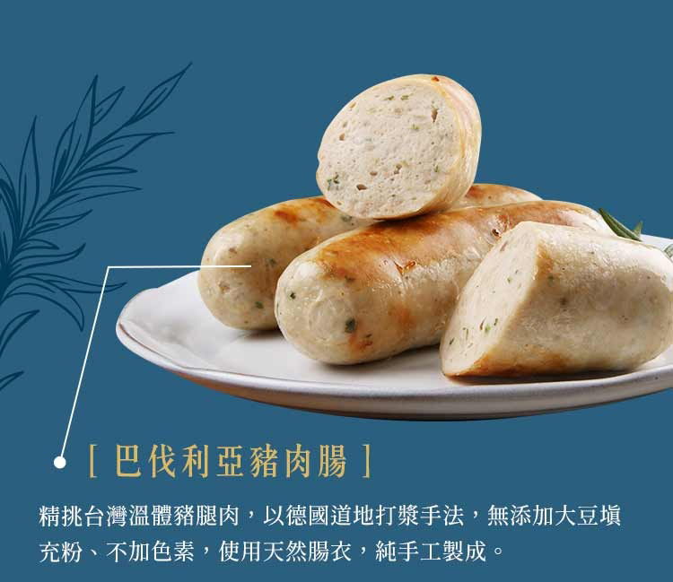 精挑台灣溫體豬腿肉,以德國道地打漿手法,無添加大豆填充粉、不加色素,使用天然腸衣,純手工製成。