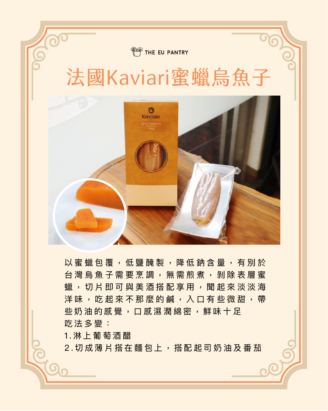 以蜜蠟包覆,低鹽醃製,降低鈉含量,有別於台灣烏魚子需要烹調,無需煎煮,剝除表層蜜蠟,切片即可與美酒搭配享用,聞起來淡淡海洋味,吃起來不那麼的鹹,入口有些微甜,帶些奶油的感覺,口感濕潤綿密,鮮味十足,過年餐桌上都要擺上一盤烏魚子,除了台灣傳統烏魚子,也試試有別於台灣風味的烏魚子吧