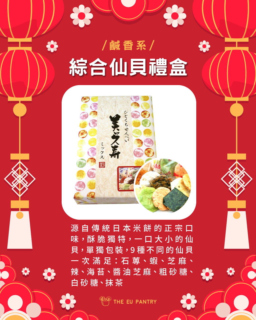 源自傳統日本米餅的正宗口味,酥脆獨特,一口大小的仙貝,單獨包裝,9種不同的仙貝一次滿足:石蓴、蝦、芝麻、辣、海苔、醬油芝麻、粗砂糖、白砂糖、抹茶