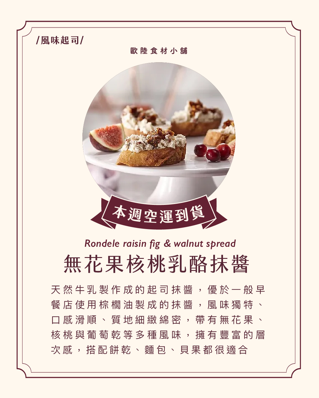 成份: 殺菌牛奶、奶蛋白、葡萄、核桃碎、無花果、糖、鹽、核桃及無花果香料