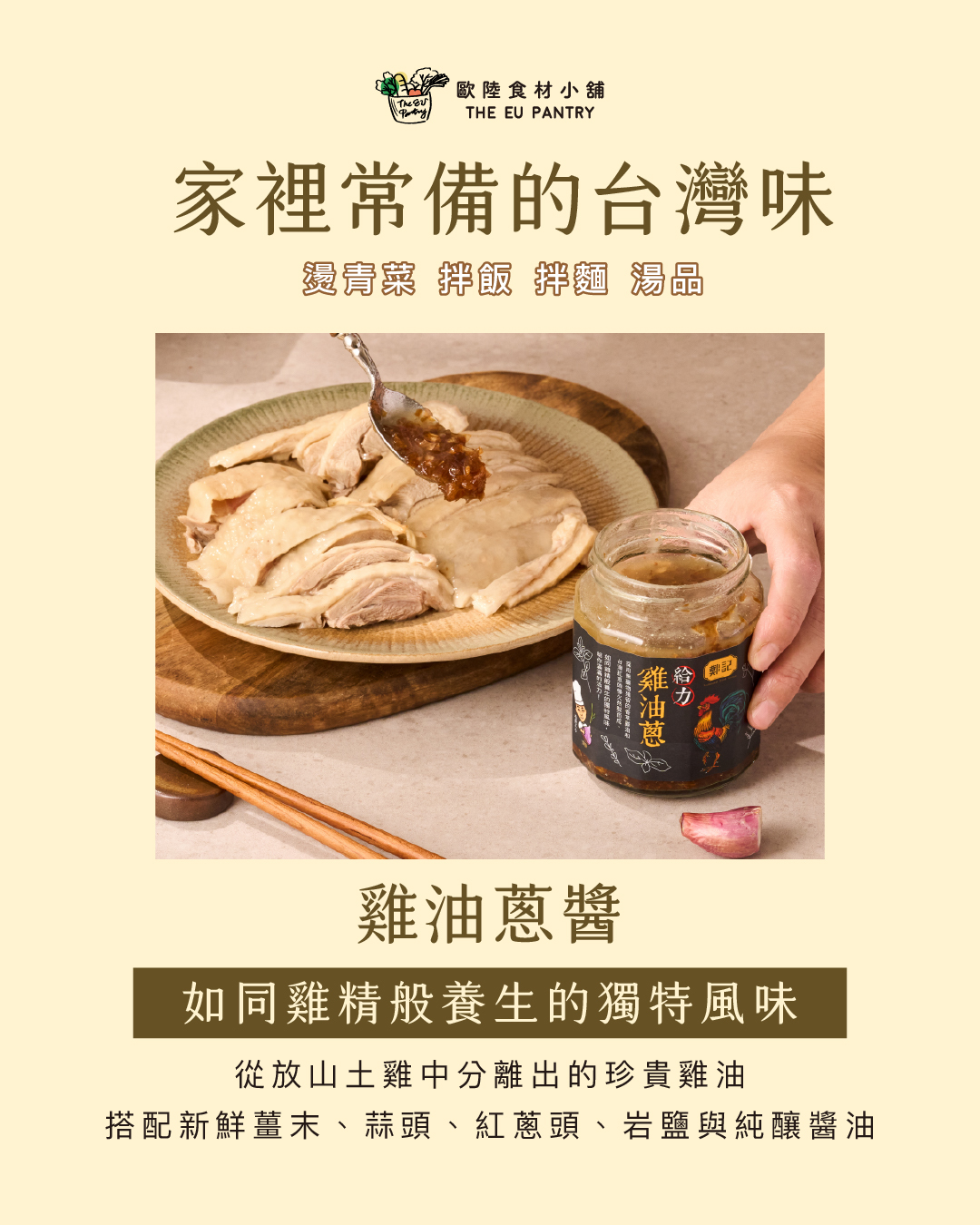 採用無藥物殘留的青草雞油和台灣紅蔥頭慢火熬製而成。如同雞精般養生的獨特風味,給你滿滿的活力!推薦吃法