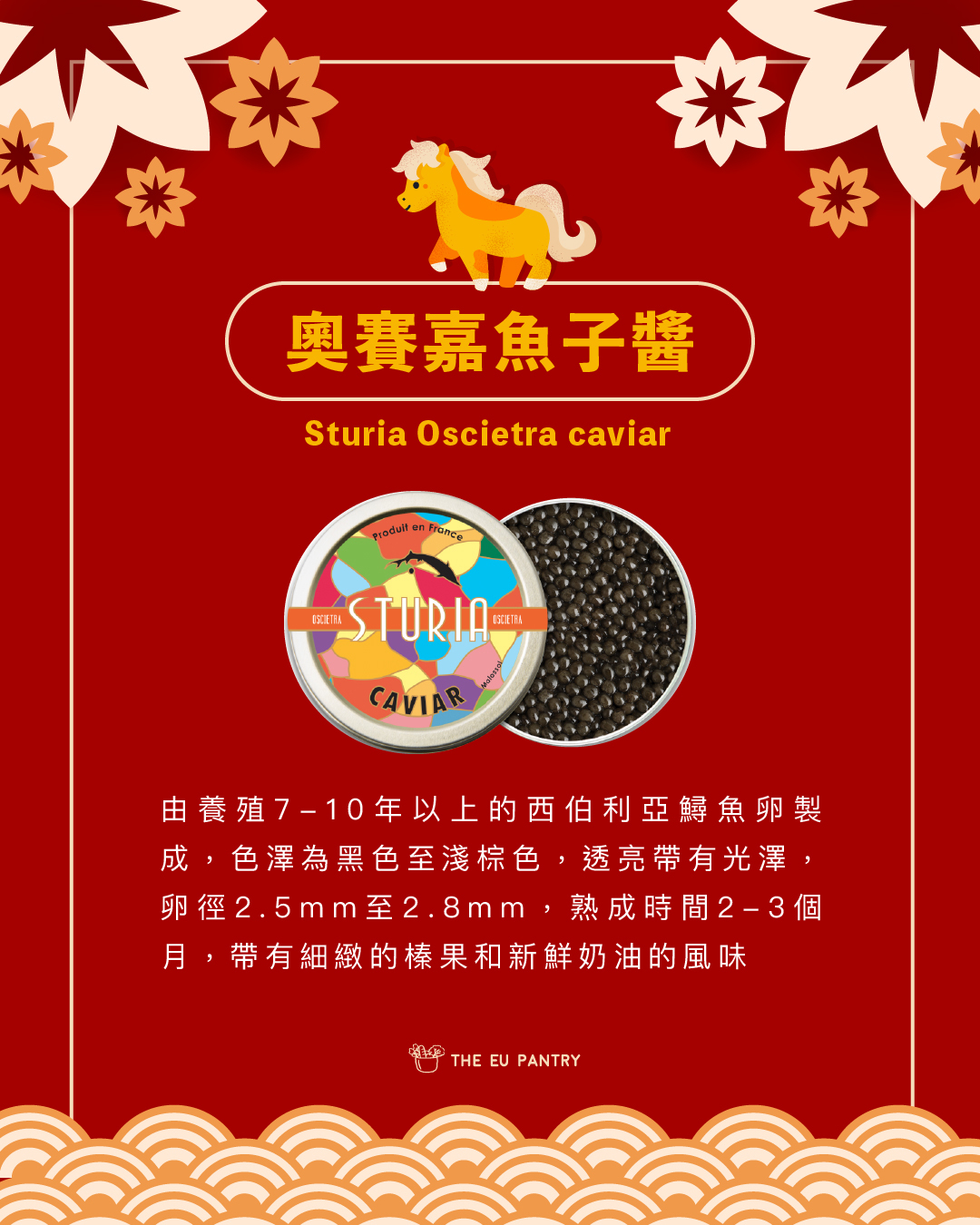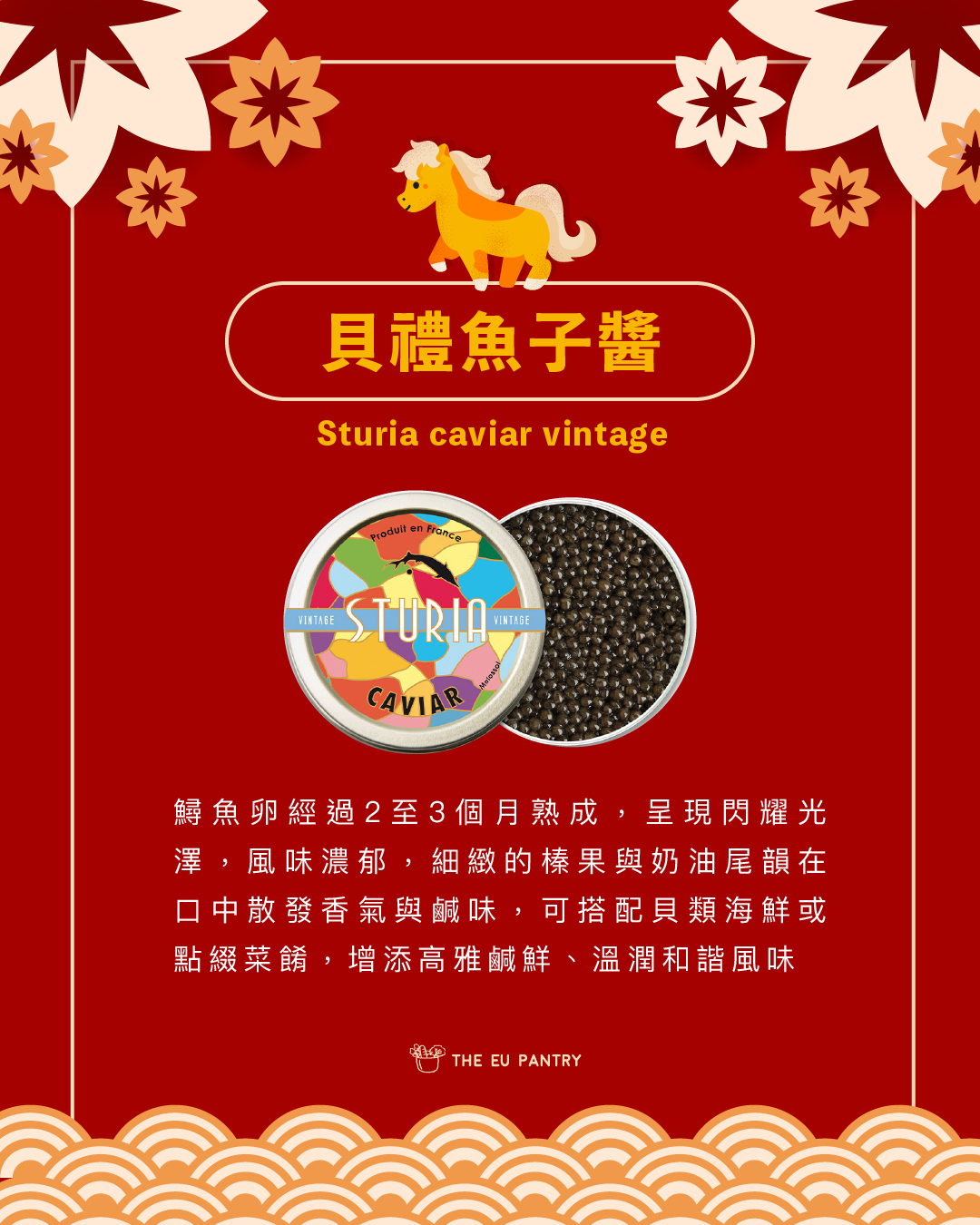 鱘魚卵經過2至3個月熟成,呈現閃耀光澤,風味濃郁,在口中散發堅果奶油香與鹹味,可搭配貝類海鮮或點綴菜餚,增添高雅鹹鮮、溫潤和諧風味。