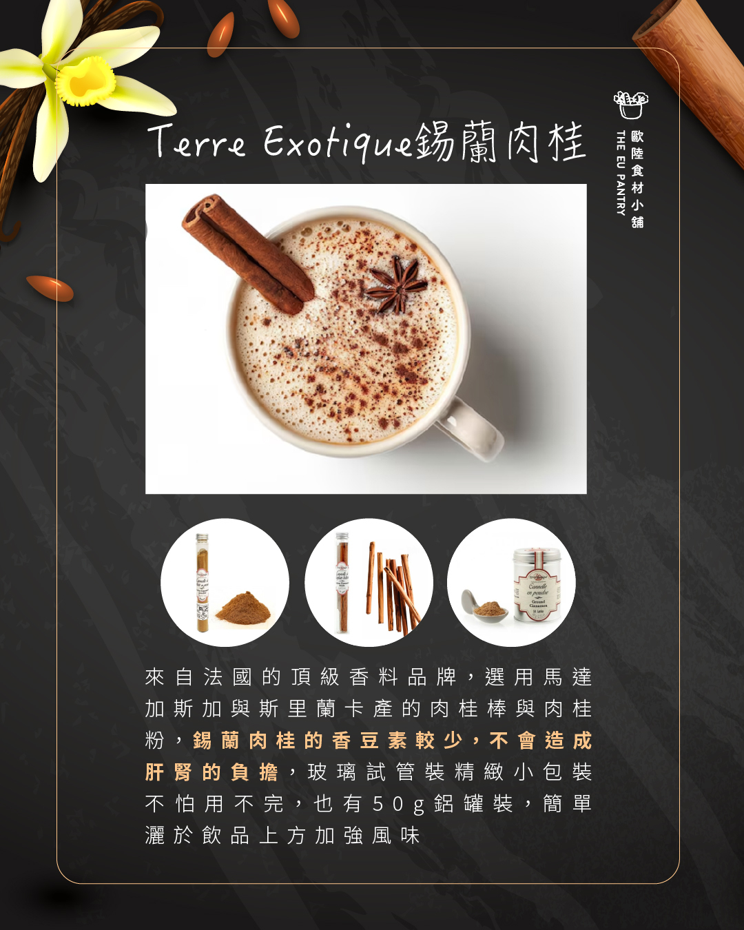 錫蘭肉桂是一種高品質,高度珍貴的香料,質地軟薄,顏色為棕褐色,聞起來輕甜並帶有木質清香,口味上比中國肉桂(Cassia Cinnamon)更溫和且帶有淡淡甜味,廣受歐洲人喜愛,也是南洋、中東料理中不可或缺的香料之一。