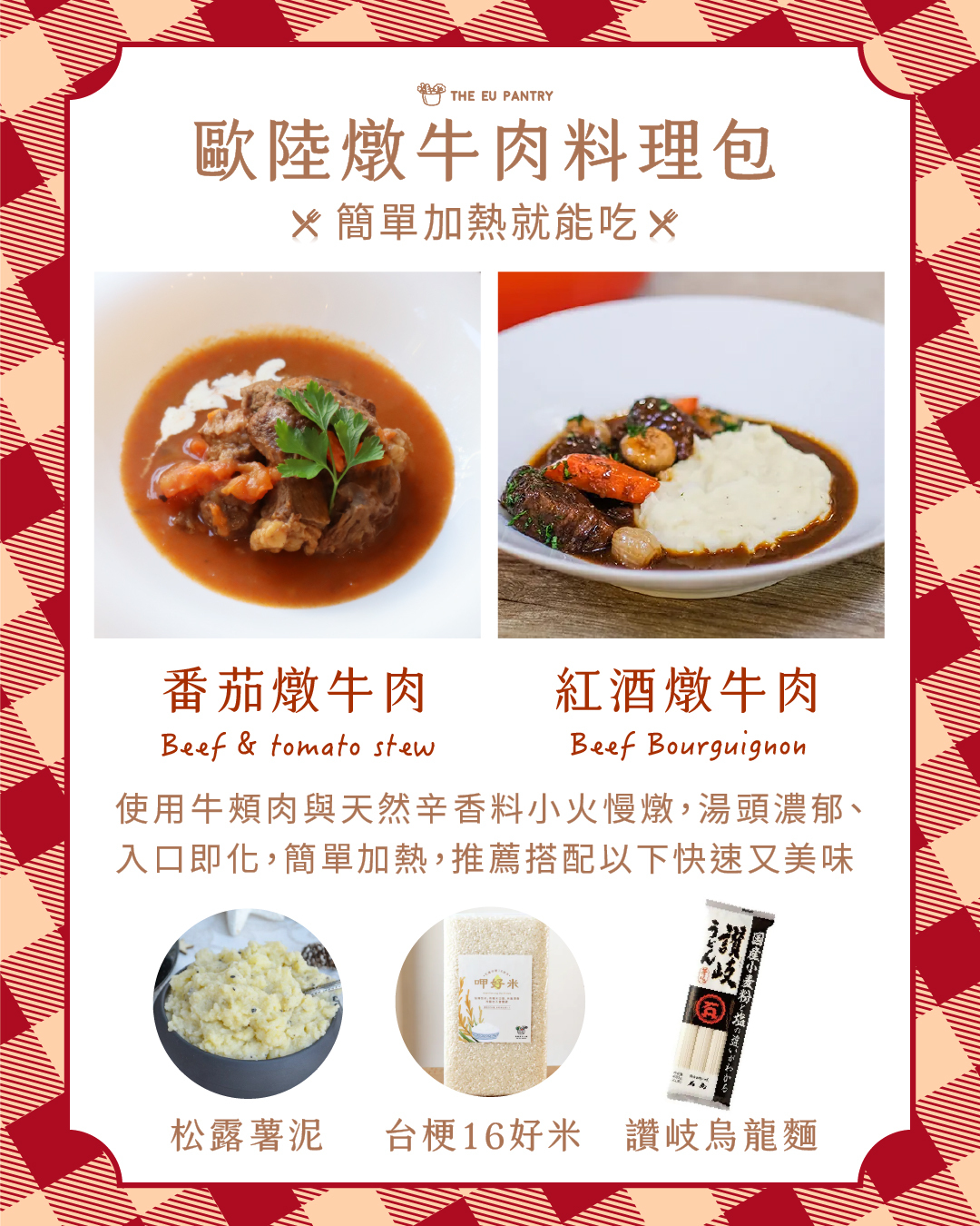 歐陸主廚使用和牛板腱,以傳統製法燉煮而成,肉汁香濃吮指回味,加熱即可輕鬆享用